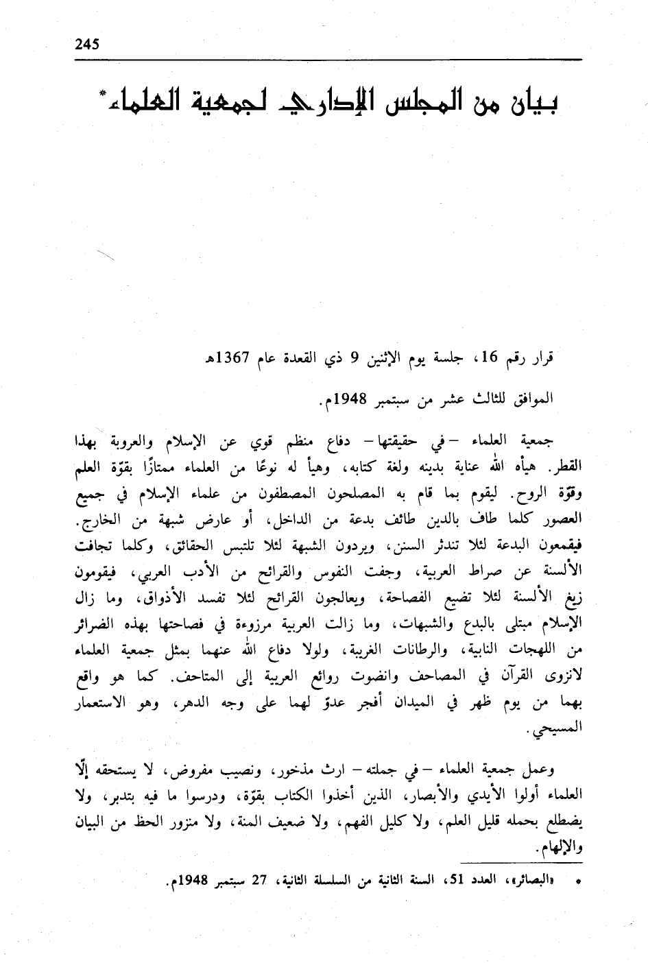 * "البصائر"، العدد 31، السنة الثانية من السلسلة الثانية، 27 سبتمبر 1948م.