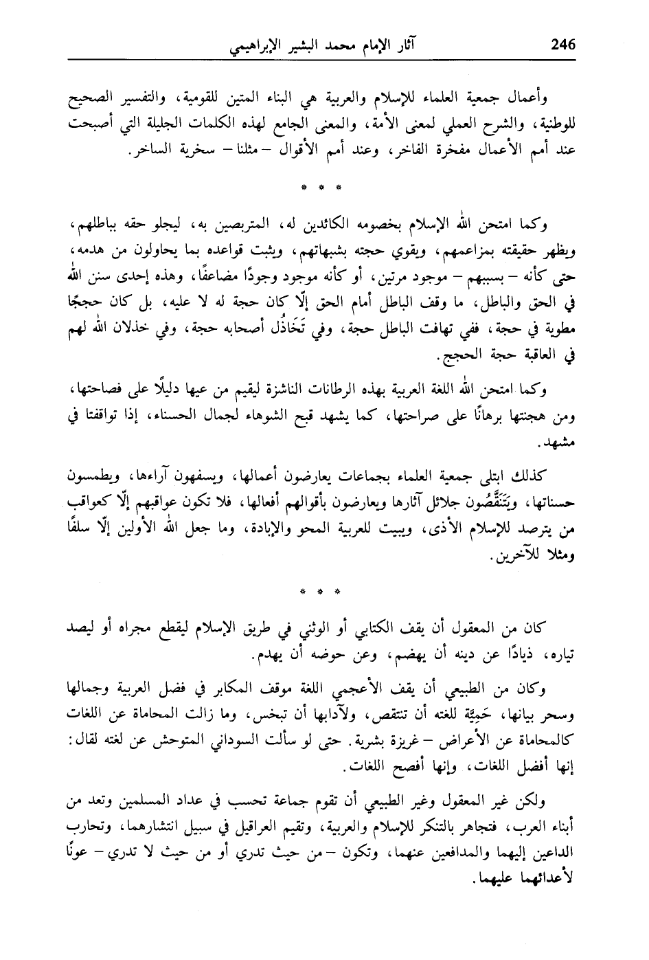 وأعمال جمعية العلماء للإسلام والعربية هي البناء المتين للقومية، والتفسير الصحيح للوطنية، والشرح العملي لمعنى الأمة، والمعنى الجامع لهذه الكلمات الجليلة التي أصبحت عند أمم الأعمال مفخرة الفاخر، وعند أمم الأقوال- مثلنا- سخرية الساخر.
