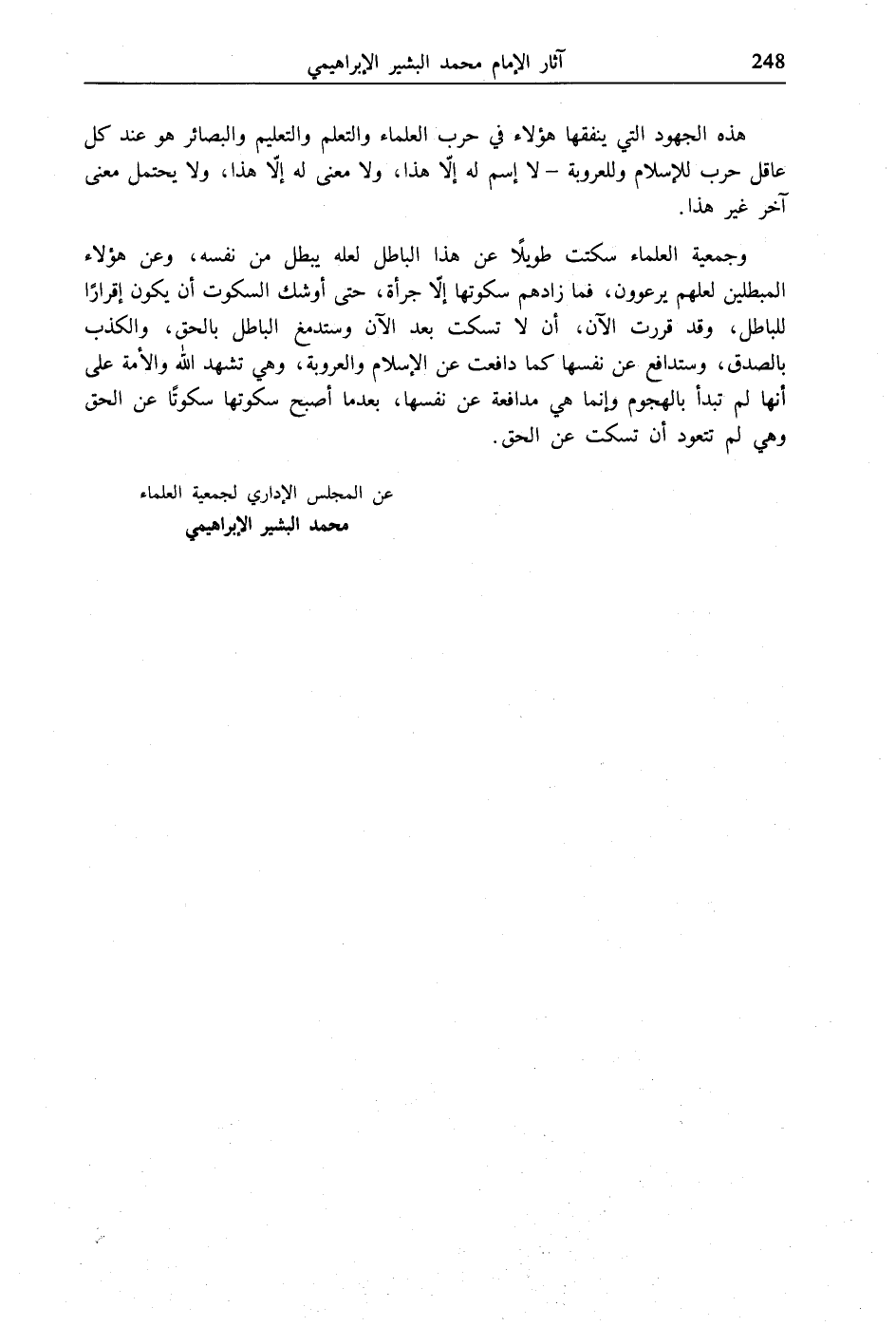 وجمعية العلماء سكتت طويلًا عن هذا الباطل لعله يبطل من نفسه، وعن هؤلاء المبطلين لعلهم يرعوون، فما زادهم سكوتها إلّا جرأة، حتى أوشك السكوت أن يكون إقرارًا للباطل، وقد قررت الآن، أن لا تسكت بعد الآن وستدمغ الباطل بالحق، والكذب بالصدق، وستدافع عن نفسها كما دافعت عن الإسلام والعروبة، وهي تشهد الله والأمة على أنها لم تبدأ بالهجوم وإنما هي مدافعة عن نفسها، بعدما أصبح سكوتها سكوتًا عن الحق وهي لم تتعود أن تسكت عن الحق.