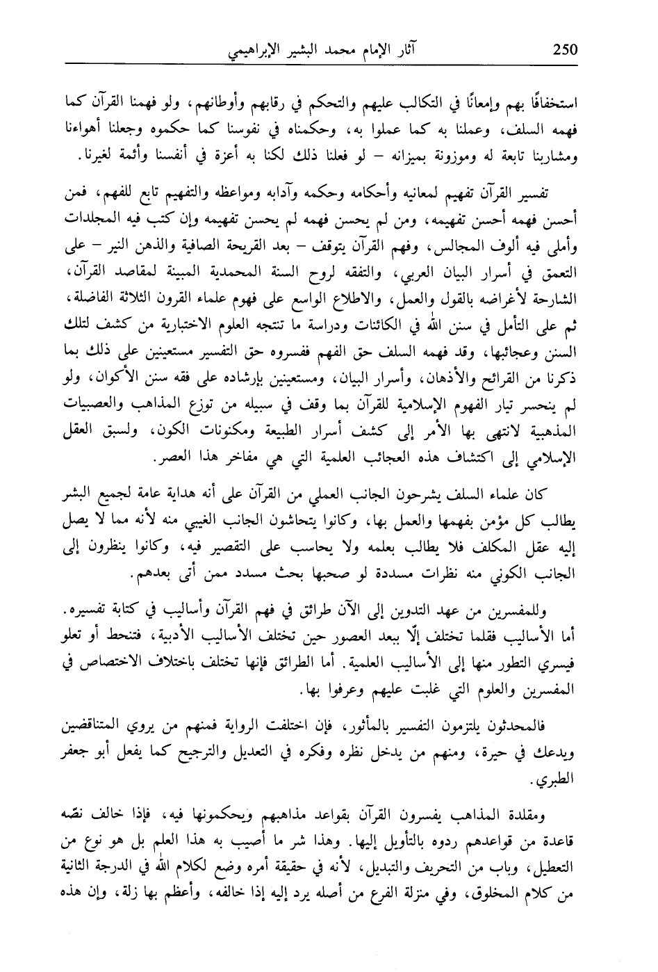 تفسير القرآن تفهيم لمعانيه وأحكامه وحكمه وآدابه ومواعظه والتفهيم تابع للفهم، فمن أحسن فهمه أحسن تفهيمه، ومن لم يحسن فهمه لم يحسن تفهيمه وإن كتب فيه المجلدات وأملى فيه ألوف المجالس، وفهم القرآن يتوقف- بعد القريحة الصافية والذهن النير- على التعمق في أسرار البيان العربي، والتفقه لروح السنة المحمدية المبينة لمقاصد القرآن، الشارحة لأغراضه بالقول والعمل، والاطلاع الواسع على فهوم علماء القرون الثلاثة الفاضلة، ثم على التأمل في سنن الله في الكائنات ودراسة ما تنتجه العلوم الاختبارية من كشف لتلك السنن وعجائبها، وقد فهمه السلف حق الفهم ففسروه حق التفسير مستعينين على ذلك بما ذكرنا من القرائح والأذهان، وأسرار البيان، ومستعينين بإرشاده على فقه سنن الأكوان، ولو لم ينحسر تيار الفهوم الإسلامية للقرآن بما وقف في سبيله من توزع المذاهب والعصبيات المذهبية لانتهى بها الأمر إلى كشف أسرار الطبيعة ومكنونات الكون، ولسبق العقل الإسلامي إلى اكتشاف هذه العجائب العلمية التي هي مفاخر هذا العصر.
