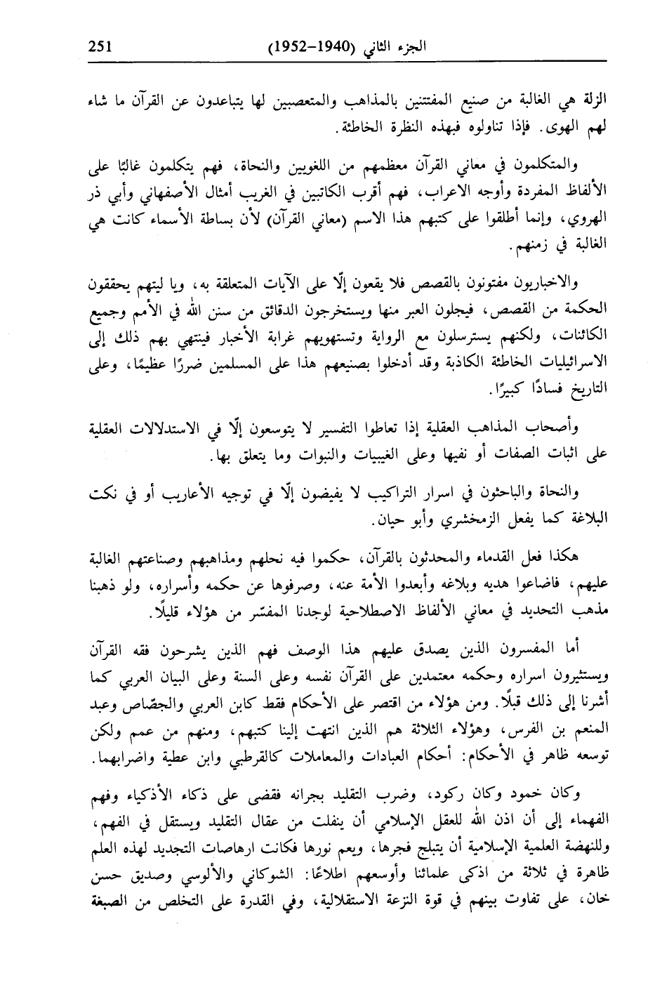 هكذا فعل القدماء والمحدثون بالقرآن، حكموا فيه نحلهم ومذاهبهم وصناعتهم الغالبة عليهم، فأضاعوا هديه وبلاغه وأبعدوا الأمة عنه، وصرفوها عن حكمه وأسراره، ولو ذهبنا مذهب التحديد في معاني الألفاظ الاصطلاحية لوجدنا المفسّر من هؤلاء قليلًا.