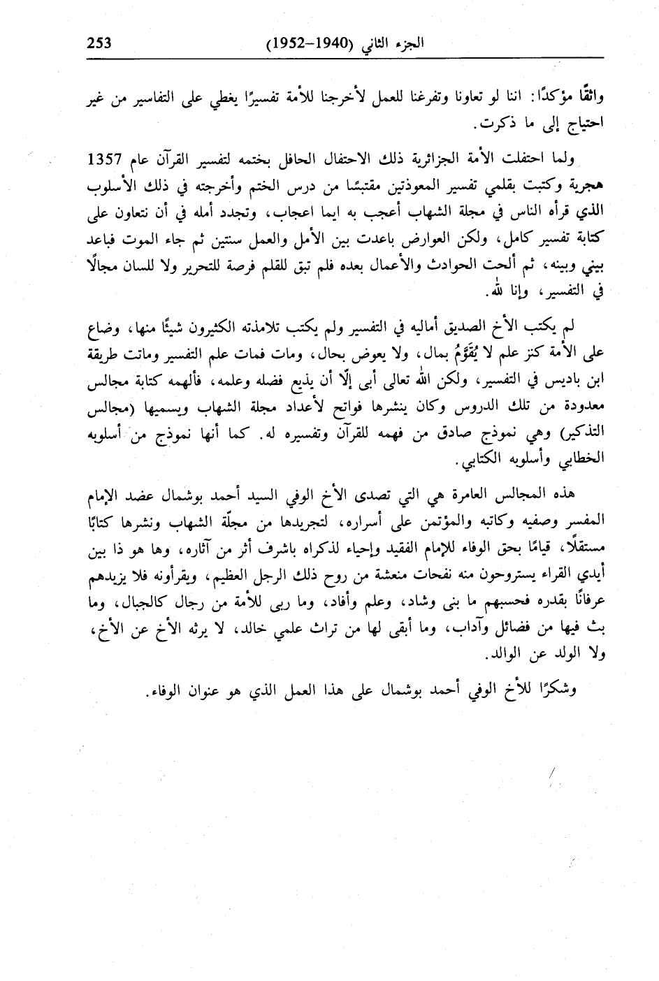 ولما احتفلت الأمة الجزائرية ذلك الاحتفال الحافل بختمه لتفسير القرآن عام 1357 هجرية وكتبت بقلمي تفسير المعوذتين مقتبسًا من درس الختم وأخرجته في ذلك الأسلوب الذي قرأه الناس في مجلة الشهاب أعجب به أيما إعجاب، وتجدد أمله في أن نتعاون على كتابة تفسير كامل، ولكن العوارض باعدت بين الأمل والعمل سنتين ثم جاء الموت فباعد بيني وبينه، ثم ألحت الحوادث والأعمال بعده فلم تبق للقلم فرصة للتحرير ولا للسان مجالًا في التفسير، وإنا لله.