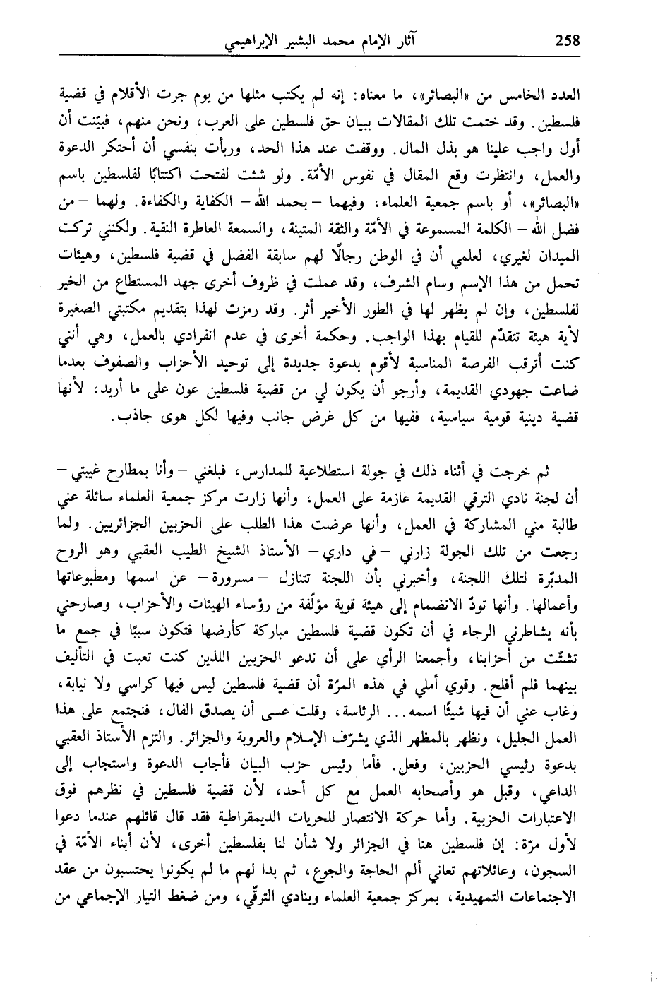 العدد الخامس من "البصائر"، ما معناه: إنه لم يكتب مثلها من يوم جرت الأقلام في قضية فلسطين. وقد ختمت تلك المقالات ببيان حق فلسطين على العرب، ونحن منهم، فبيّنت أن أول واجب علينا هو بذل المال. ووقفت عند هذا الحد، وربأت بنفسي أن أحتكر الدعوة والعمل، وانتظرت وقع المقال في نفوس الأمّة. ولو شئت لفتحت اكتتابًا لفلسطين باسم "البصائر"، أو باسم جمعية العلماء، وفيهما- بحمد الله- الكفاية والكفاءة. ولهما- من فضل الله- الكلمة المسموعة في الأمّة والثقة المتينة، والسمعة العاطرة النقية. ولكنني تركت الميدان لغيري، لعلمي أن في الوطن رجالًا لهم سابقة الفضل في قضية فلسطين، وهيئات تحمل من هذا الإسم وسام الشرف، وقد عملت في ظروف أخرى جهد المستطاع من الخير لفلسطين، وإن لم يظهر لها في الطور الأخير أثر. وقد رمزت لهذا بتقديم مكتبتي الصغيرة لأية هيئة تتقدّم للقيام بهذا الواجب. وحكمة أخرى في عدم انفرادي بالعمل، وهي أنني كنت أترقب الفرصة المناسبة لأقوم بدعوة جديدة إلى توحيد الأحزاب والصفوف بعدما ضاعت جهودي القديمة، وأرجو أن يكون لي من قضية فلسطين عون على ما أريد، لأنها قضية دينية قومية سياسية، ففيها من كل غرض جانب وفيها لكل هوى جاذب.