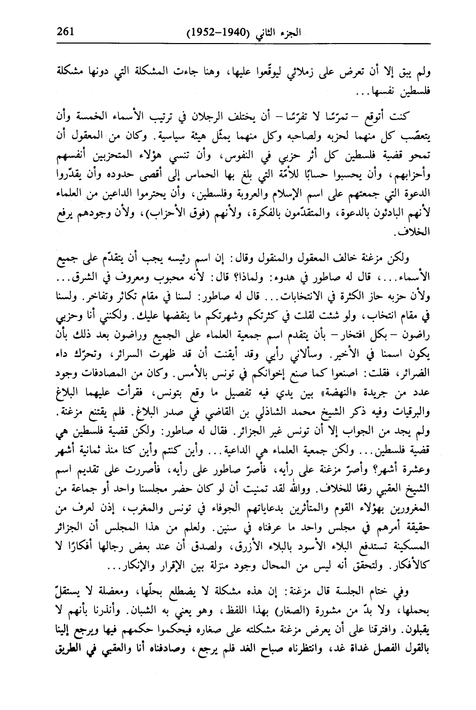 ولكن مزغنة خالف المعقول والمنقول وقال: إن اسم رئيسه يجب أن يتقدّم على جميع الأسماء ... ، قال له صاطور في هدوء: ولماذا؟ قال: لأنه محبوب ومعروف في الشرق ... ولأن حزبه حاز الكثرة في الانتخابات ... قال له صاطور: لسنا في مقام تكاثر وتفاخر. ولسنا في مقام انتخاب، ولو شئت لقلت في كثرتكم وشهرتكم ما ينقضها عليك. ولكنني أنا وحزبي راضون- بكل افتخار- بأن يتقدم اسم جمعية العلماء على الجميع وراضون بعد ذلك بأن يكون اسمنا في الأخير. وسألاني رأيي وقد أيقنت أن قد ظهرت السرائر، وتحرّك داء الضرائر، فقلت: اصنعوا كما صنع إخوانكم في تونس بالأمس. وكان من المصادفات وجود عدد من جريدة "النهضة" بين يدي فيه تفصيل ما وقع بتونس، فقرأت عليهما البلاغ والبرقيات وفيه ذكر الشيخ محمد الشاذلي بن القاضي في صدر البلاغ. فلم يقتنع مزغنة. ولم يجد من الجواب إلا أن تونس غير الجزائر. فقال له صاطور: ولكن قضية فلسطين هي قضية فلسطين ... ولكن جمعية العلماء هي الداعية ... وأين كنتم وأين كنا منذ ثمانية أشهر وعشرة أشهر؟ وأصرّ مزغنة على رأيه، فأصرّ صاطور على رأيه، فأصررت على تقديم اسم الشيخ العقبي رفعًا للخلاف. ووالله لقد تمنيت أن لو كان حضر مجلسنا واحد أو جماعة من المغرورين بهؤلاء القوم والمتأثرين بدعاياتهم الجوفاء في تونس والمغرب، إذن لعرف من حقيقة أمرهم في مجلس واحد ما عرفناه في سنين. ولعلم من هذا المجلس أن الجزائر المسكينة تستدفع البلاء الأسود بالبلاء الأزرق، ولصدق أن عند بعض رجالها أفكارًا لا كالأفكار. ولتحقق أنه ليس من المحال وجود منزلة بين الإقرار والإنكار ...