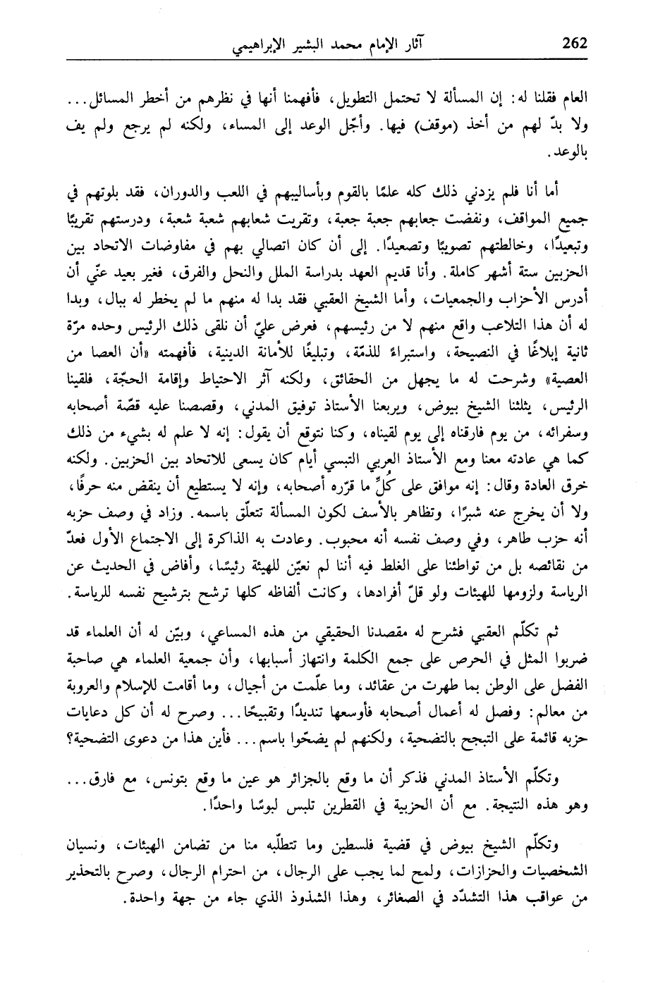 أما أنا فلم يزدني ذلك كله علمًا بالقوم وبأساليبهم في اللعب والدوران، فقد بلوتهم في جميع المواقف، ونفضت جعابهم جعبة جعبة، وتقريت شعابهم شعبة شعبة، ودرستهم تقريبًا وتبعيدًا، وخالطتهم تصويبًا وتصعيدًا. إلى أن كان اتصالي بهم في مفاوضات الاتحاد بين الحزبين ستة أشهر كاملة. وأنا قديم العهد بدراسة الملل والنحل والفرق، فغير بعيد عنّي أن أدرس الأحزاب والجمعيات، وأما الشيخ العقبي فقد بدا له منهم ما لم يخطر له ببال، وبدا له أن هذا التلاعب واقع منهم لا من رئيسهم، فعرض عليّ أن نلقى ذلك الرَّئِيسُ وحده مرّة ثانية إبلاغًا في النصيحة، واستبراءً للذمّة، وتبليغًا للأمانة الدينية، فأفهمته "أن العصا من العصية" وشرحت له ما يجهل من الحقائق، ولكنه آثر الاحتياط وإقامة الحجّة، فلقينا الرَّئِيسُ، يثلثنا الشيخ بيوض، ويربعنا الأستاذ توفيق المدني، وقصصنا عليه قصّة أصحابه وسفرائه، من يوم فارقناه إلى يوم لقيناه، وكنا نتوقع أن يقول: إنه لا علم له بشيء من ذلك كما هي عادته معنا ومع الأستاذ العربي التبسي أيام كان يسعى للاتحاد بين الحزبين. ولكنه خرق العادة وقال: إنه موافق على كُلِّ ما قرّره أصحابه، وإنه لا يستطيع أن ينقض منه حرفًا، ولا أن يخرج عنه شبرًا، وتظاهر بالأسف لكون المسألة تتعلّق باسمه. وزاد في وصف حزبه أنه حزب طاهر، وفي وصف نفسه أنه محبوب. وعادت به الذاكرة إلى الاجتماع الأول فعدّ من نقائصه بل من تواطئنا على الغلط فيه أننا لم نعيّن للهيئة رئيسًا، وأفاض في الحديث عن الرياسة ولزومها للهيئات ولو قلّ أفرادها، وكانت ألفاظه كلها ترشح بترشيح نفسه للرياسة.