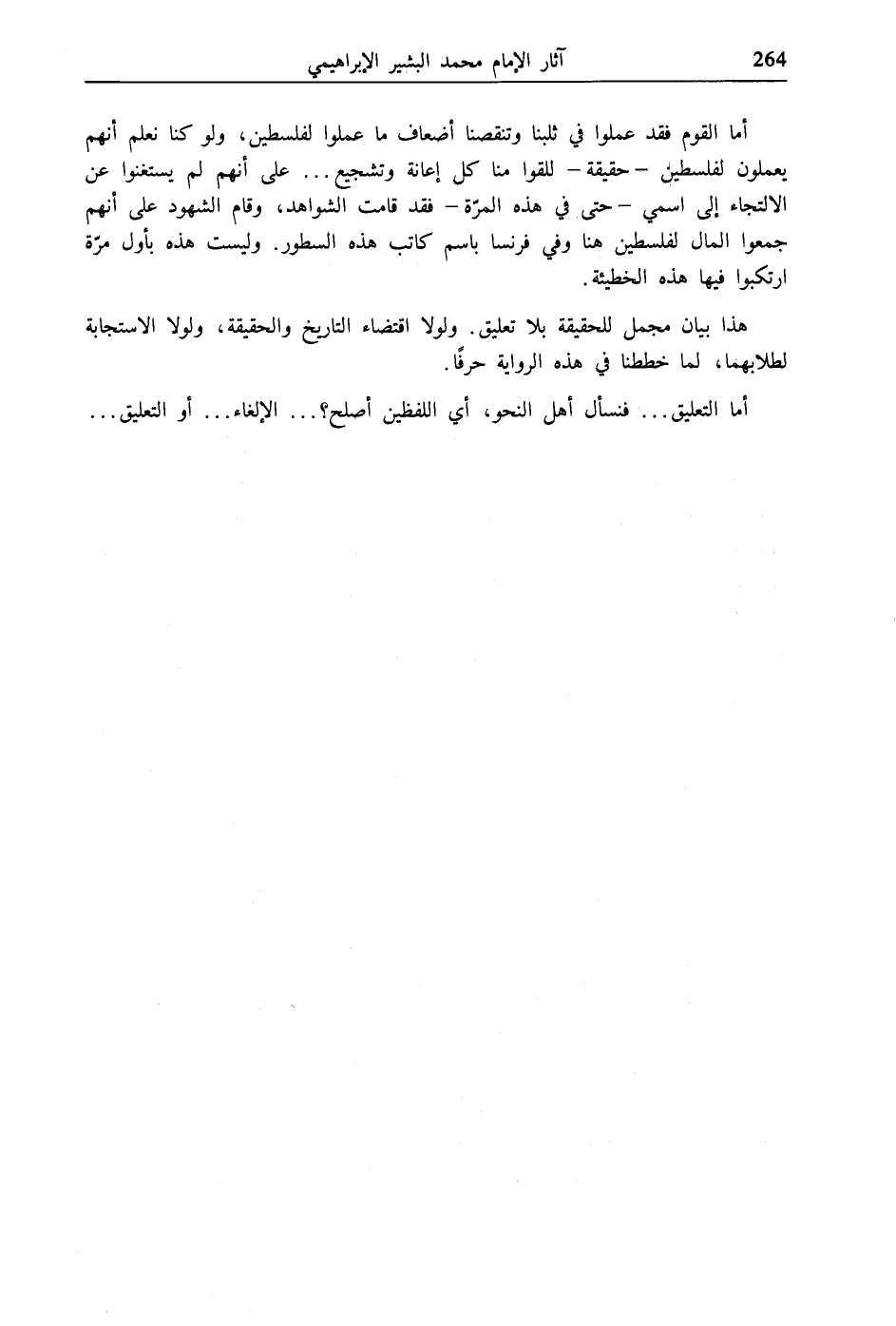 أما القوم فقد عملوا في ثلبنا وتنقصنا أضعاف ما عملوا لفلسطين، ولو كنا نعلم أنهم يعملون لفلسطين- حقيقة- للقوا منا كل إعانة وتشجيع ... على أنهم لم يستغنوا عن الالتجاء إلى اسمي- حتى في هذه المرّة- فقد قامت الشواهد، وقام الشهود على أنهم جمعوا المال لفلسطين هنا وفي فرنسا باسم كاتب هذه السطور. وليست هذه بأول مرّة ارتكبوا فيها هذه الخطيئة.