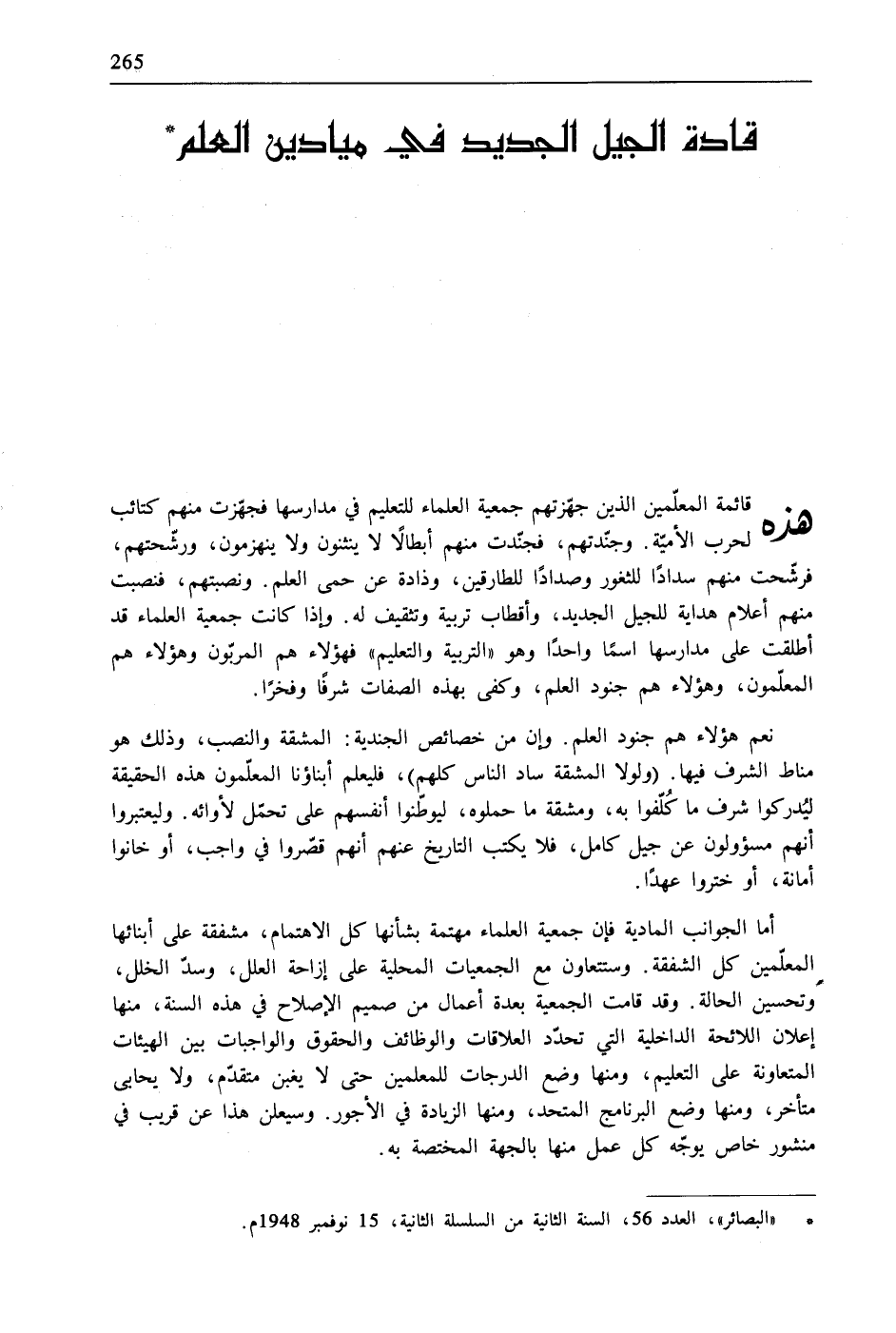 * "البصائر"، العدد 36، السنة الثانية من السلسلة الثانية، 15 نوفمبر 1948م.