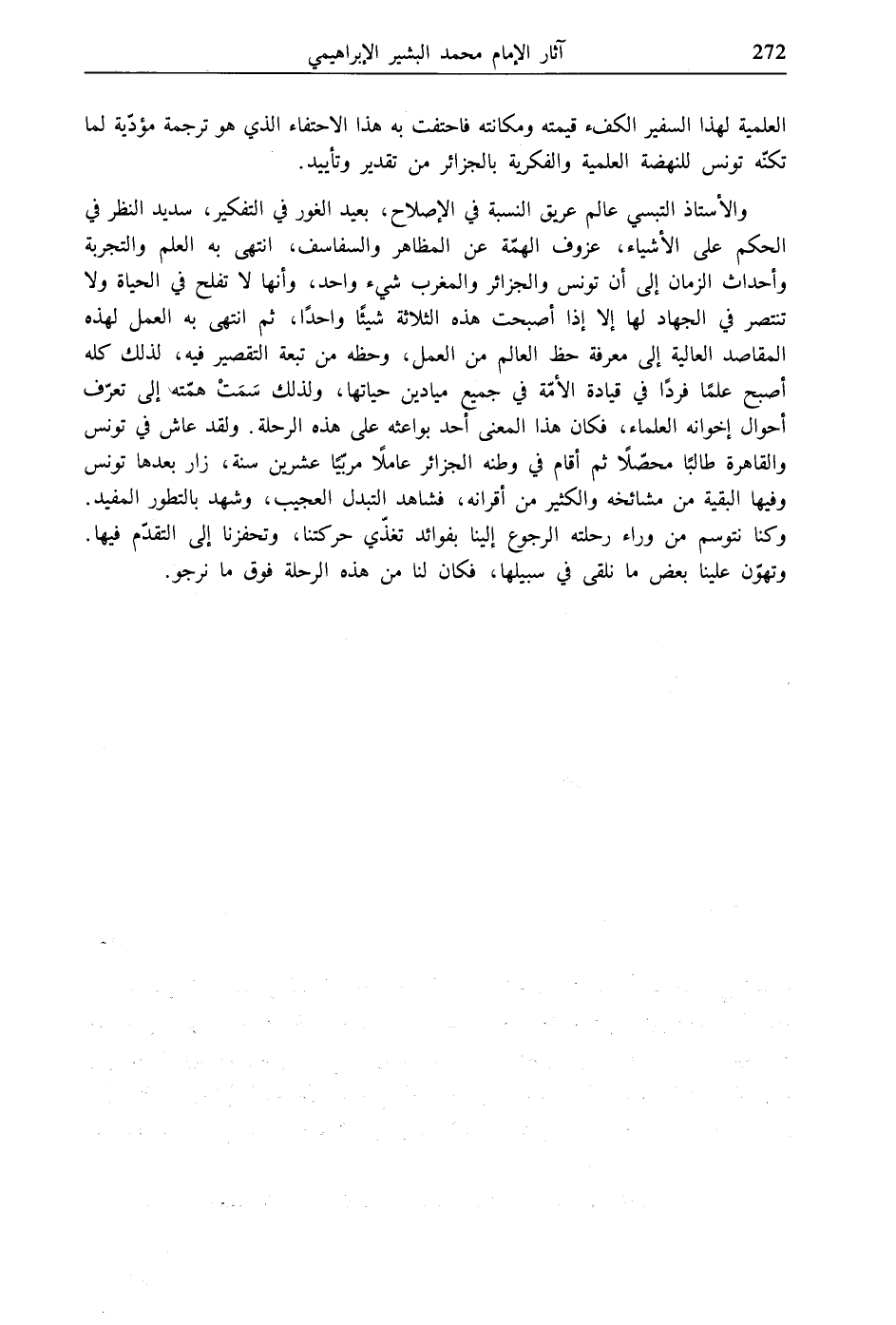 والأستاذ التبسي عالم عريق النسبة في الإصلاح، بعيد الغور في التفكير، سديد النظر في الحكم على الأشياء، عزوف الهمّة عن المظاهر والسفاسف، انتهى به العلم والتجربة وأحداث الزمان إلى أن تونس والجزائر والمغرب شيء واحد، وأنها لا تفلح في الحياة ولا تنتصر في الجهاد لها إلا إذا أصبحت هذه الثلاثة شيئًا واحدًا، ثم انتهى به العمل لهذه المقاصد العالية إلى معرفة حظ العالم من العمل، وحظه من تبعة التقصير فيه، لذلك كله أصبح علمًا فردًا في قيادة الأمّة في جميع ميادين حياتها، ولذلك سَمَتْ همّته إلى تعرّف أحوال إخوانه العلماء، فكان هذا المعنى أحد بواعثه على هذه الرحلة. ولقد عاش في تونس والقاهرة طالبًا محصّلًا ثم أقام في وطنه الجزائر عاملًا مربّيًا عشرين سنة، زار بعدها تونس وفيها البقية من مشائخه والكثير من أقرانه، فشاهد التبدل العجيب، وشهد بالتطور المفيد. وكنا نتوسم من وراء رحلته الرجوع إلينا بفوائد تغذّي حركتنا، وتحفزنا إلى التقدّم فيها. وتهوّن علينا بعض ما نلقى في سبيلها، فكان لنا من هذه الرحلة فوق ما نرجو.