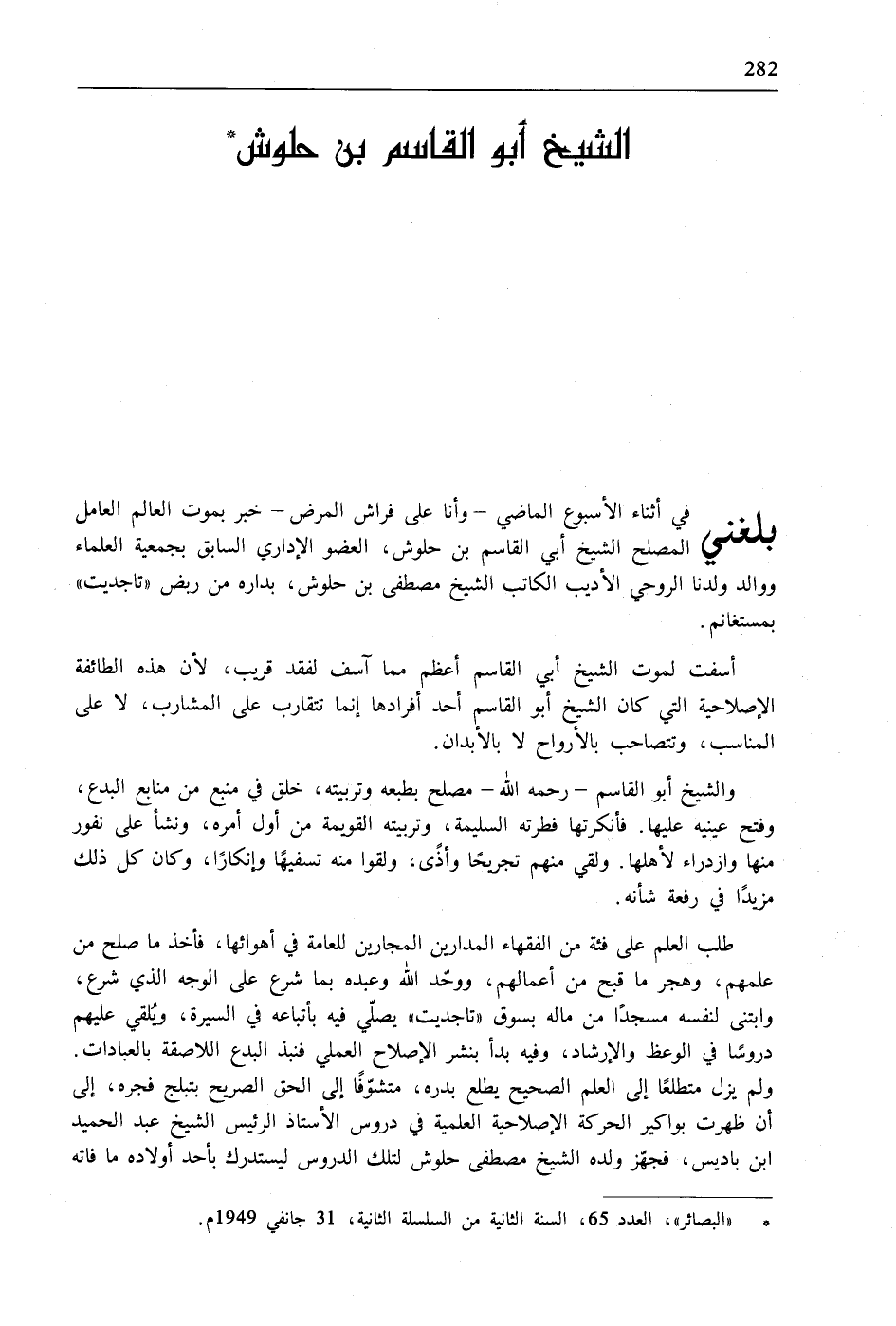 بلغني في أثناء الأسبوع الماضي- وأنا على فراش المرض- خبر بموت العالم العامل المصلح الشيخ أبي القاسم بن حلوش، العضو الإداري السابق بجمعية العلماء