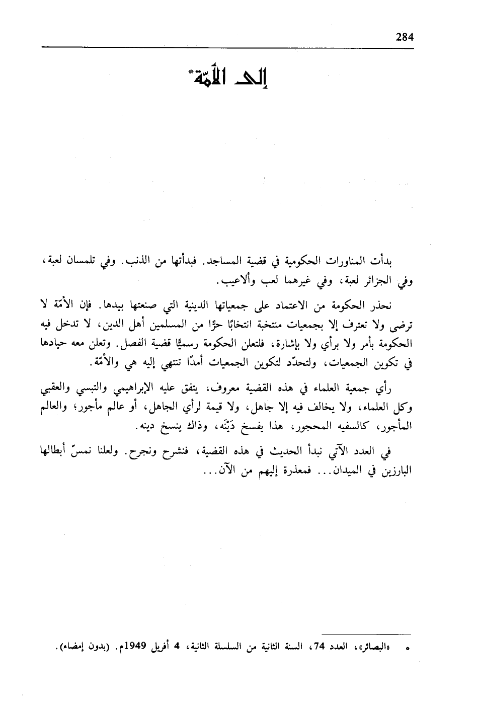 نحذر الحكومة من الاعتماد على جمعياتها الدينية التي صنعتها بيدها. فإن الأمّة لا ترضى ولا تعترف إلا بجمعيات منتخبة انتخابًا حرًّا من المسلمين أهل الدين، لا تدخل فيه الحكومة بأمر ولا برأي ولا بإشارة، فلتعلن الحكومة رسميًّا قضية الفصل. وتعلن معه حيادها في تكوين الجمعيات، ولتحدّد لتكوين الجمعيات أمدًا تنتهي إليه هي والأمّة.