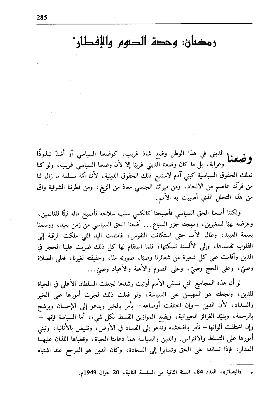 * "البصائر"، العدد 84، السنة الثانية من السلسلة الثانية، 20 جوان 1949م.