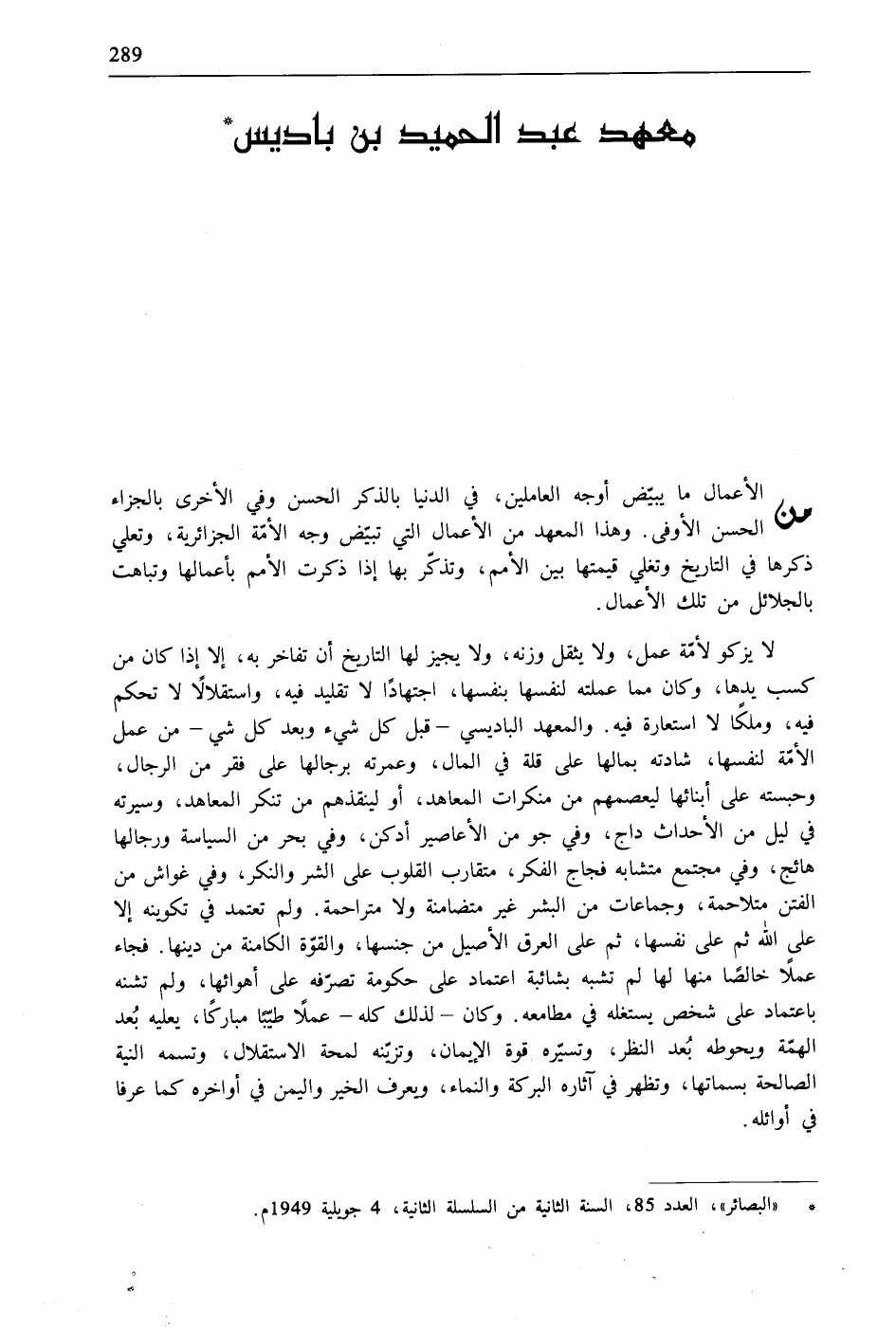 * "البصائر"، العدد 85، السنة الثانية من السلسلة الثانية، 4 جويلية 1949م.