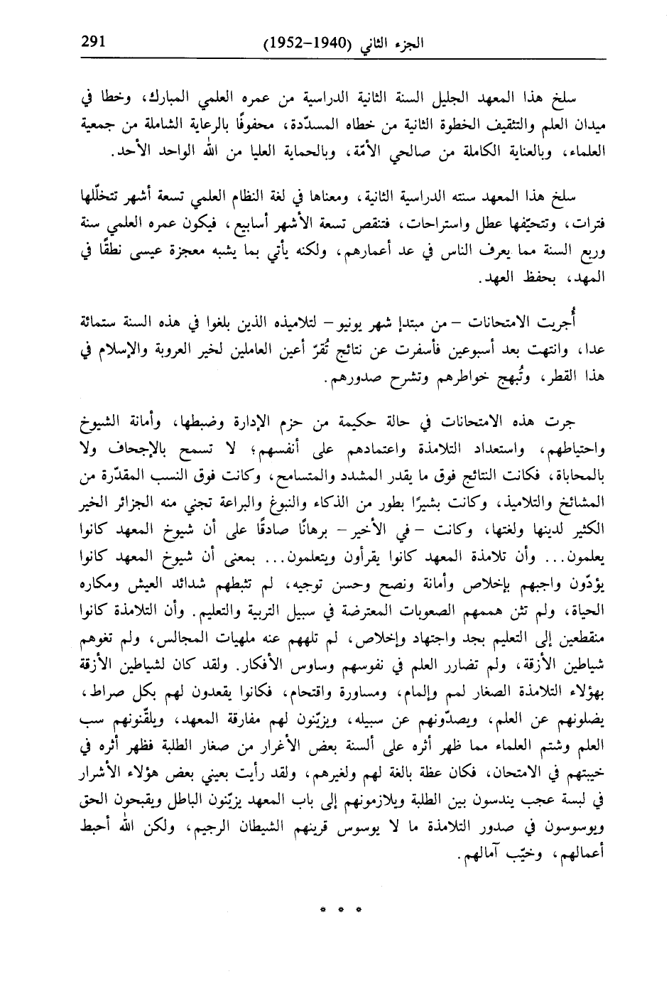 سلخ هذا المعهد الجليل السنة الثانية الدراسية من عمره العلمي المبارك، وخطا في ميدان العلم والتثقيف الخطوة الثانية من خطاه المسدّدة، محفوفًا بالرعاية الشاملة من جمعية العلماء، وبالعناية الكاملة من صالحي الأمّة، وبالحماية العليا من الله الواحد الأحد.