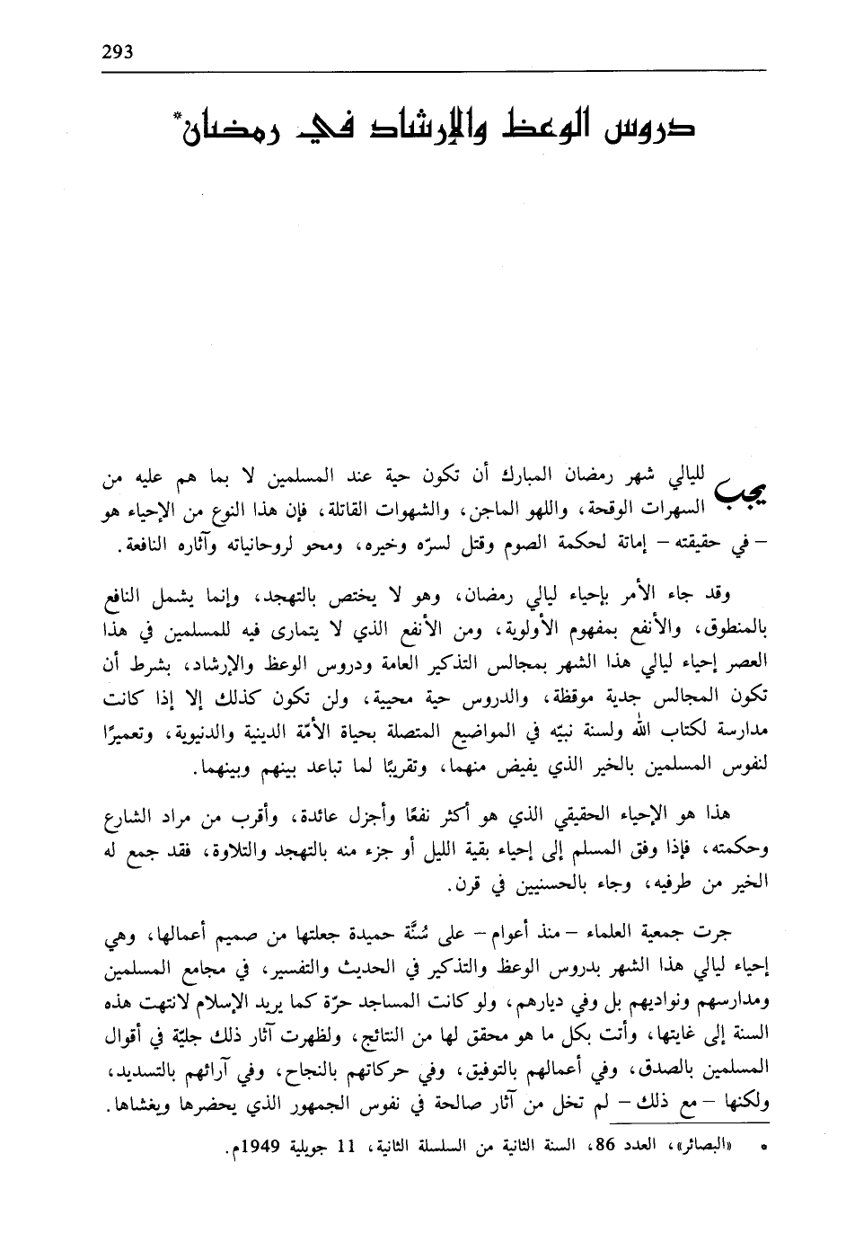 جرت جمعية العلماء- منذ أعوام- على سُنَّة حميدة جعلتها من صميم أعمالها، وهي إحياء ليالي هذا الشهر بدروس الوعظ والتذكير في الحديث والتفسير، في مجامع المسلمين ومدارسهم ونواديهم بل وفي ديارهم، ولو كانت المساجد حرّة كما يريد الإسلام لانتهت هذه السنة إلى غايتها، وأتت بكل ما هو محقق لها من النتائج، ولظهرت آثار ذلك جليّة في أقوال المسلمين بالصدق، وفي أعمالهم بالتوفيق، وفي حركاتهم بالنجاح، وفي آرائهم بالتسديد، ولكنها- مع ذلك- لم تخل من آثار صالحة في نفوس الجمهور الذي يحضرها ولغشاها.