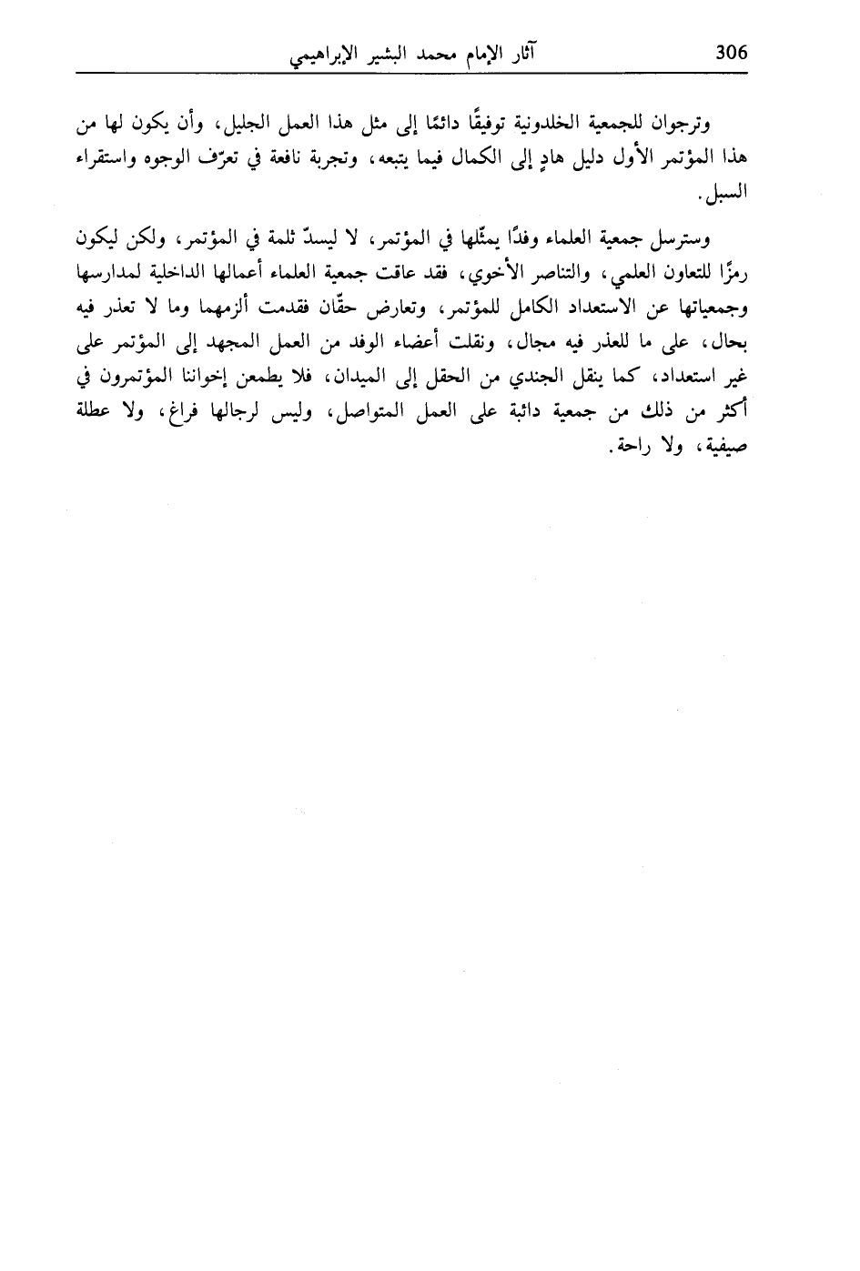 وسترسل جمعية العلماء وفدًا يمثّلها في المؤتمر، لا ليسدّ ثلمة في المؤتمر، ولكن ليكون رمزًا للتعاون العلمي، والتناصر الأخوي، فقد عاقت جمعية العلماء أعمالها الداخلية لمدارسها وجمعياتها عن الاستعداد الكامل للمؤتمر، وتعارض حقّان فقدمت ألزمهما وما لا تعذر فيه بحال، على ما للعذر فيه مجال، ونقلت أعضاء الوفد من العمل المجهد إلى المؤتمر على غير استعداد، كما ينقل الجندي من الحقل إلى الميدان، فلا يطمعن إخواننا المؤتمرون في أكثر من ذلك من جمعية دائبة على العمل المتواصل، وليس لرجالها فراغ، ولا عطلة صيفية، ولا راحة.
