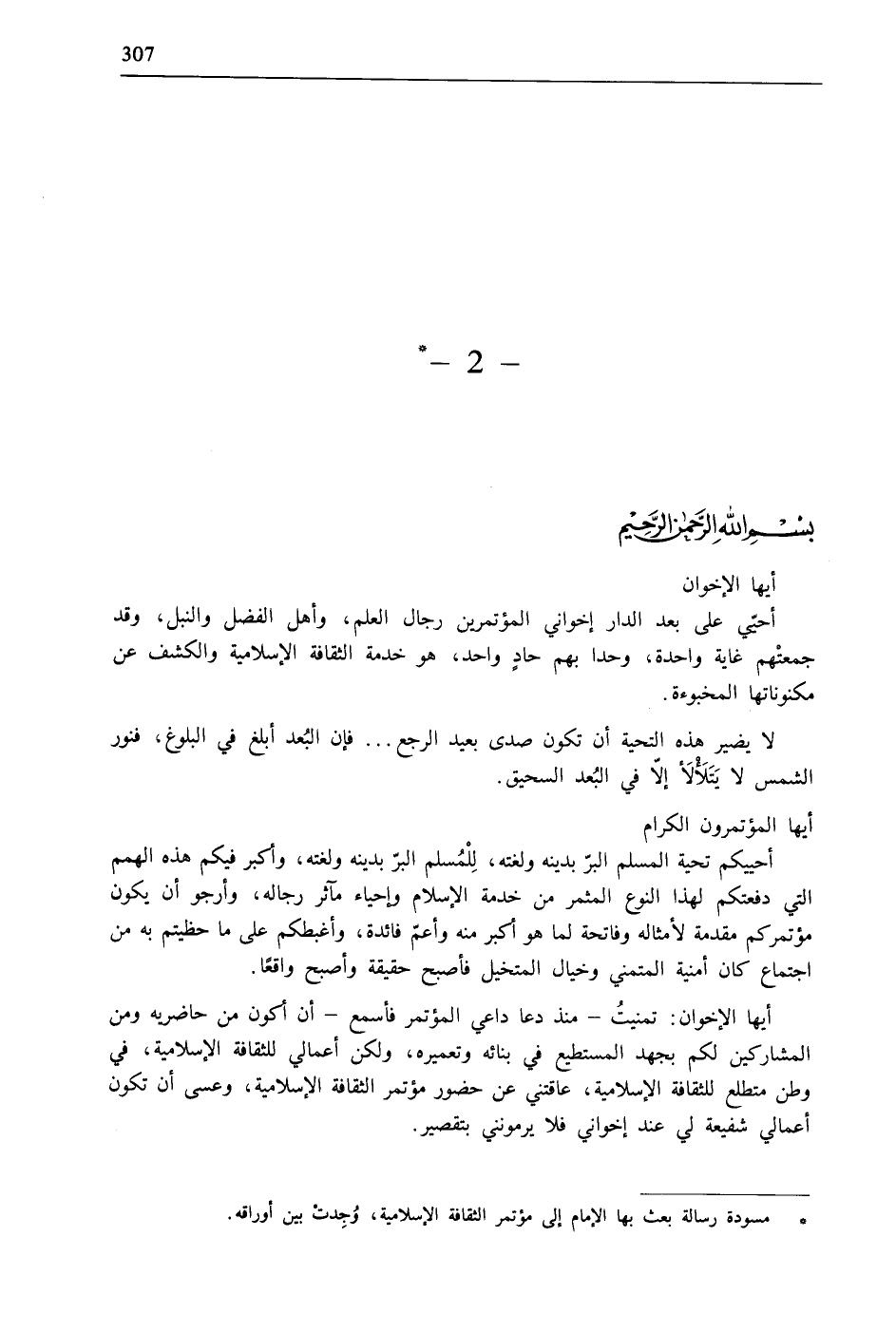 * مسودة رسالة بعث بها الإمام إلى مؤتمر الثقافة الإسلامية، وُجِدتْ بين أوراقه.
