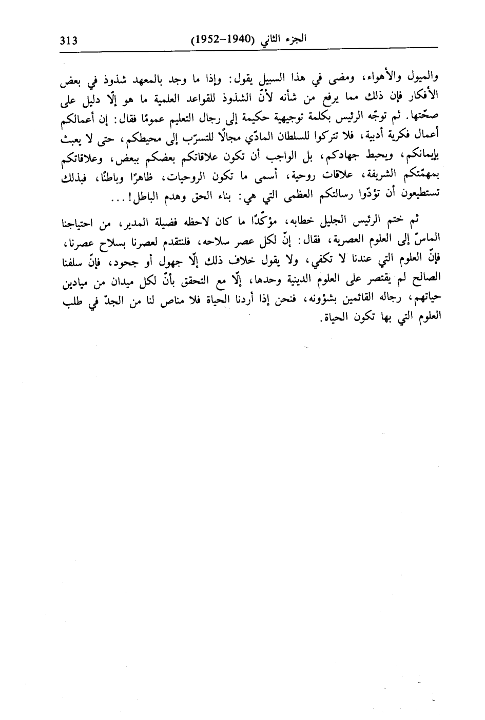 ثم ختم الرَّئِيسُ الجليل خطابه، مؤكّدًا ما كان لاحظه فضيلة المدير، من احتياجنا الماسّ إلى العلوم العصرية، فقال: إن لكل عصر سلاحه، فلنتقدم لعصرنا بسلاح عصرنا، فإن العلوم التي عندنا لا تكفي، ولا يقول خلاف ذلك إلّا جهول أو جحود، فإنّ سلفنا الصالح لم يقتصر على العلوم الدينية وحدها، إلّا مع التحقق بأنّ لكل ميدان من ميادين حياتهم، رجاله القائمين بشؤونه، فنحن إذا أردنا الحياة فلا مناص لنا من الجدّ في طلب العلوم التي بها تكون الحياة.