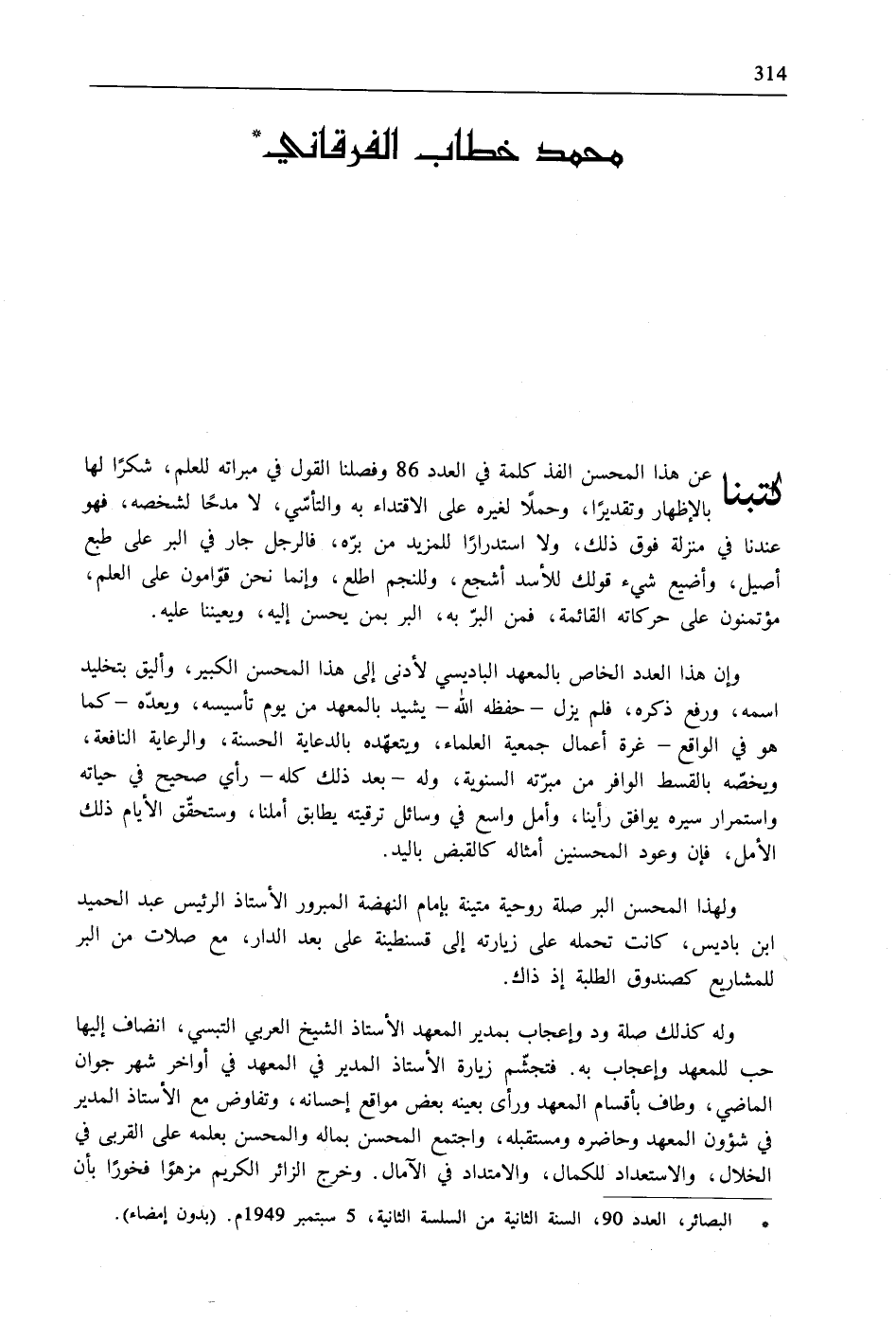 وإن هذا العدد الخاص بالمعهد الباديسي لأدنى إلى هذا المحسن الكبير، وأليق بتخليد اسمه، ورفع ذكره، فلم يزل- حفظه الله- يشيد بالمعهد من يوم تأسيسه، ويعدّه- كما هو في الواقع- غرة أعمال جمعية العلماء، ويتعهّده بالدعاية الحسنة، والرعاية النافعة، ويخصّه بالقسط الوافر من مبرّته السنوية، وله- بعد ذلك كله- رأي صحيح في حياته واستمرار سيره يوافق رأينا، وأمل واسع في وسائل ترقيته يطابق أملنا، وستحقّق الأيام ذلك الأمل، فإن وعود المحسنين أمثاله كالقبض باليد.