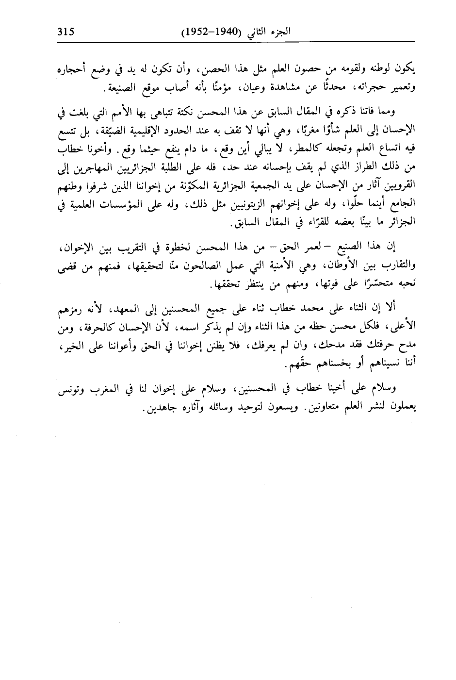 وسلام على أخينا خطاب في المحسنين، وسلام على إخوان لنا في المغرب وتونس يعملون لنشر العلم متعاونين. ويسعون لتوحيد وسائله وآثاره جاهدين.