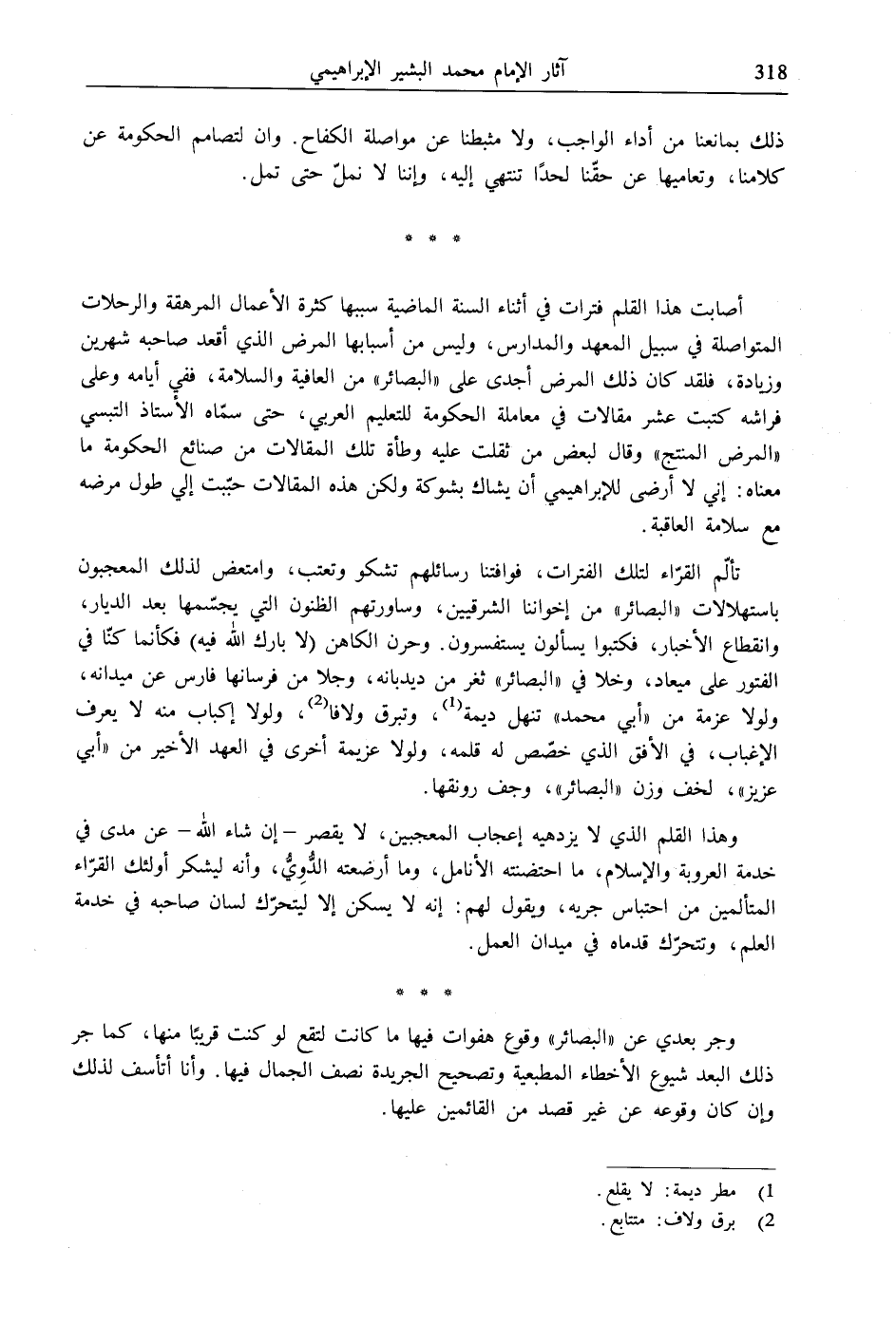 أصابت هذا القلم فترات في أثناء السنة الماضية سببها كثرة الأعمال المرهقة والرحلات المتواصلة في سبيل المعهد والمدارس، وليس من أسبابها المرض الذي أقعد صاحبه شهرين وزيادة، فلقد كان ذلك المرض أجدى على "البصائر" من العافية والسلامة، ففي أيامه وعلى فراشه كتبت عشر مقالات في معاملة الحكومة للتعليم العربي، حتى سمّاه الأستاذ التبسي "المرض المنتج" وقال لبعض من ثقلت عليه وطأة تلك المقالات من صنائع الحكومة ما معناه: إني لا أرضى للإبراهيمي أن يشاك بشوكة ولكن هذه المقالات حبّبت إلي طول مرضه مع سلامة العاقبة.