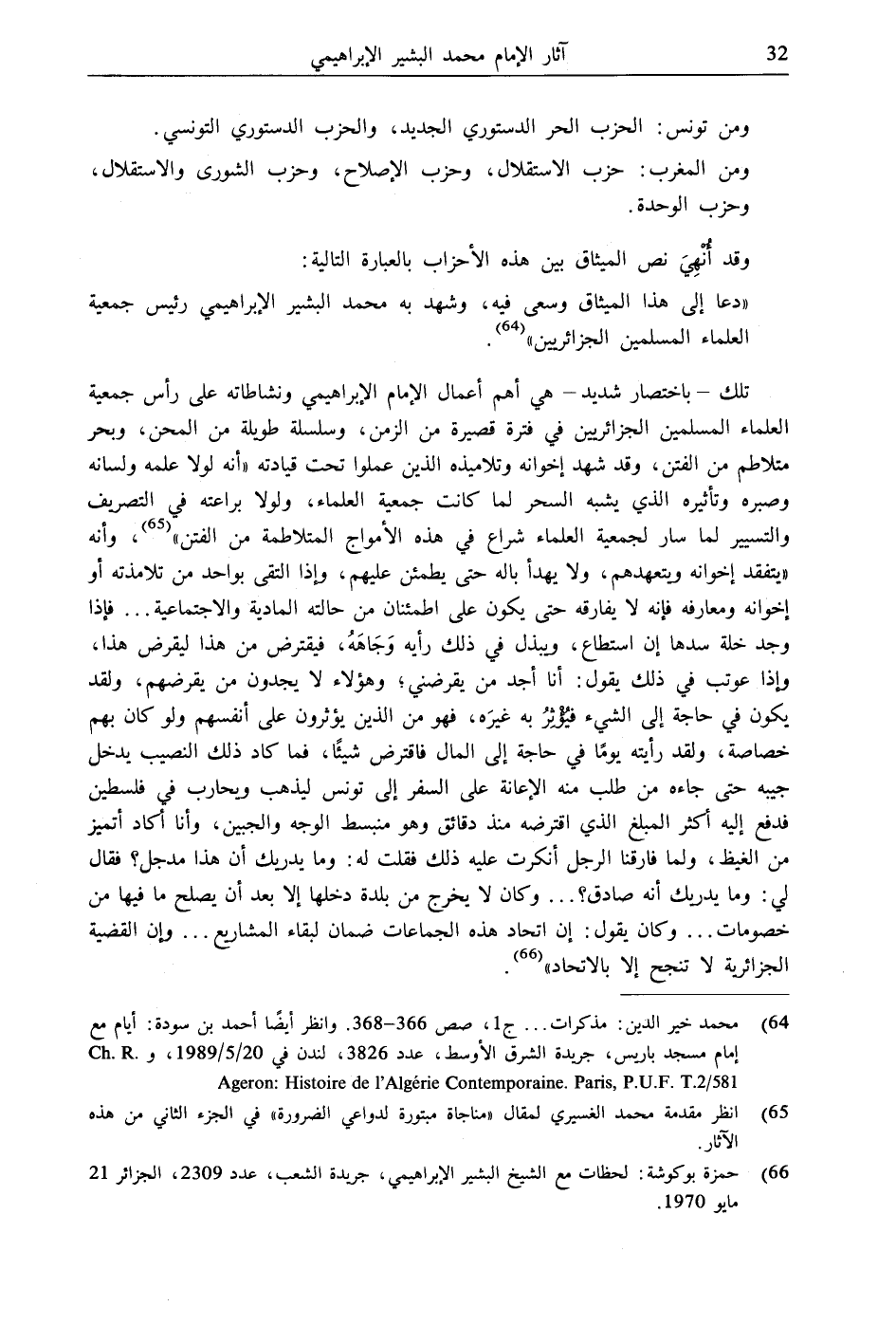64) محمد خير الدين: مذكرات ... ج 1، صص 366 - 368. وانظر أيضًا أحمد بن سودة: أيام مع إمام مسجد باريس، جريدة الشرق الأوسط، عدد 3826، لندن في 20/ 5/ 1989 و Ch. R.