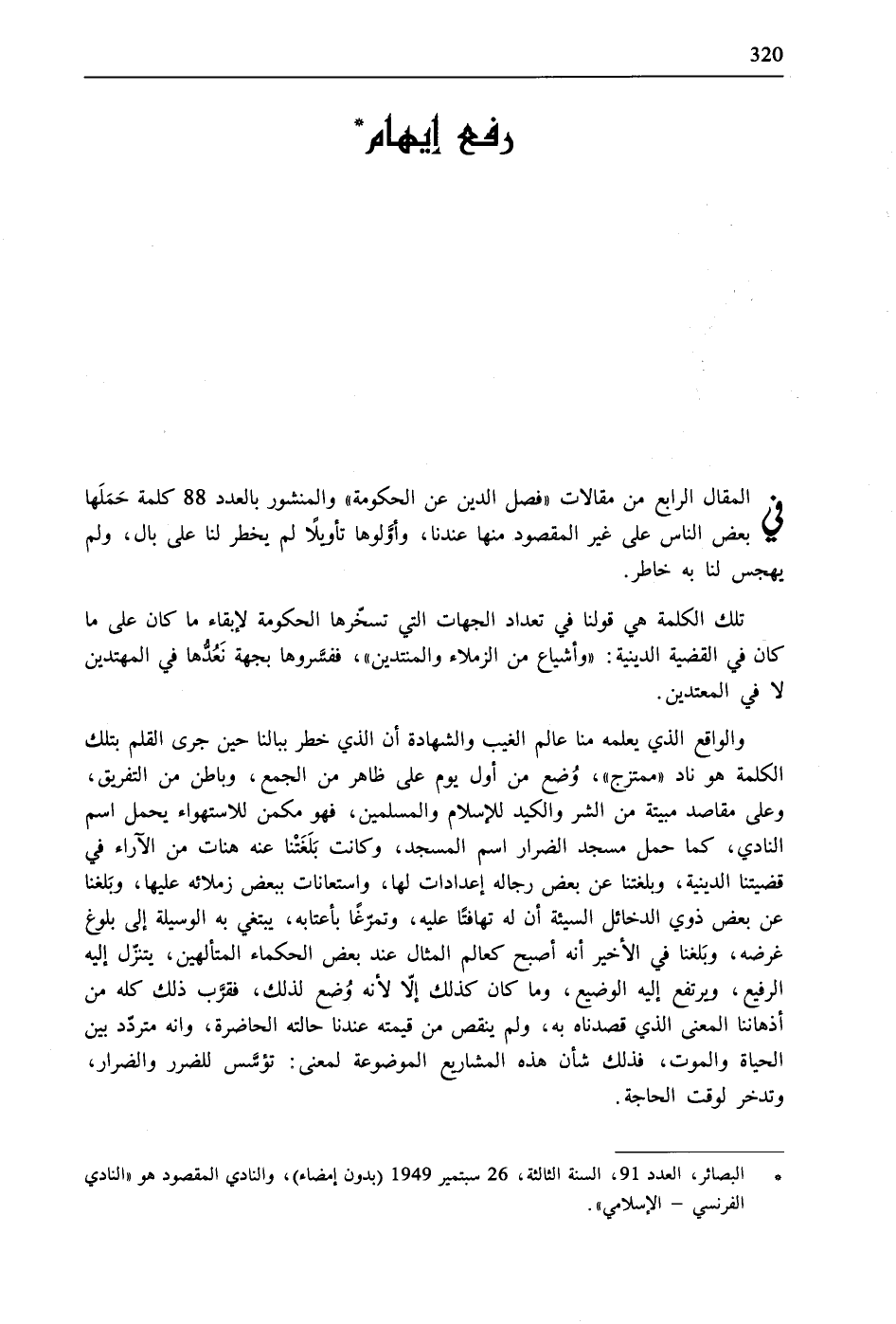 والواقع الذي يعلمه منا عالم الغيب والشهادة أن الذي خطر ببالنا حين جرى القلم بتلك الكلمة هو ناد "ممتزج "، وُضع من أول يوم على ظاهر من الجمع، وباطن من التفريق، وعلى مقاصد مبيتة من الشر والكيد للإسلام والمسلمين، فهو مكمن للاستهواء يحمل اسم النادي، كما حمل مسجد الضرار اسم المسجد، وكانت بَلَغَتْنا عنه هنات من الآراء في قضيتنا الدينية، وبلغتنا عن بعض رجاله إعدادات لها، واستعانات ببعض زملائه عليها، وبَلغنا عن بعض ذوي الدخائل السيئة أن له تهافتًا عليه، وتمرّغًا بأعتابه، يبتغي به الوسيلة إلى بلوغ غرضه، وبَلغنا في الأخير أنه أصبح كعالم المثال عند بعض الحكماء المتألهين، يتنزل إليه الرفيع، ويرتفع إليه الوضيع، وما كان كذلك إلّا لأنه وُضع لذلك، فقرَّب ذلك كله من أذهاننا المعنى الذي قصدناه به، ولم ينقص من قيمته عندنا حالته الحاضرة، وانه متردّد بين الحياة والموت، فذلك شأن هذه المشاريع الموضوعة لمعنى: تؤسَّس للضرر والضرار، وتدخر لوقت الحاجة.