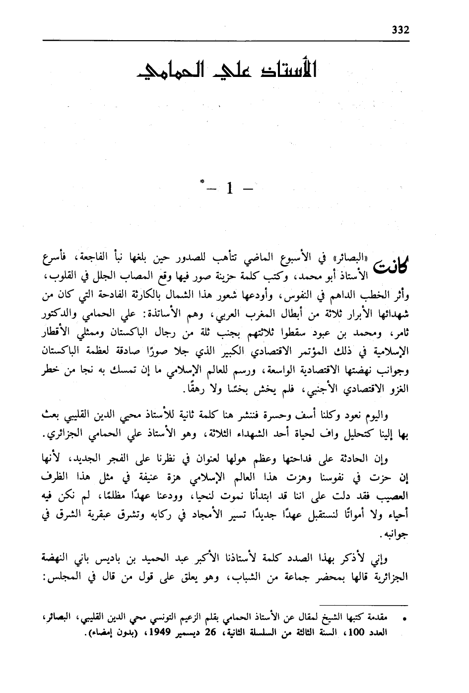 كانت "البصائر" في الأسبوع الماضي تتأهب للصدور حين بلغها نبأ الفاجعة، فأسرع الأستاذ أبو محمد، وكتب كلمة حزينة صور فيها وقع المصاب الجلل في القلوب، وأثر الخطب الداهم في النفوس، وأودعها شعور هذا الشمال بالكارثة الفادحة التي كان من شهدائها الأبرار ثلاثة من أبطال المغرب العربي، وهم الأساتذة: علي الحمامي والدكتور ثامر، ومحمد بن عبود سقطوا ثلاثتهم بجنب ثلة من رجال الباكستان وممثلي الأقطار الإسلامية في ذلك المؤتمر الاقتصادي الكبير الذي جلا صورًا صادقة لعظمة الباكستان وجوانب نهضتها الاقتصادية الواسعة، ورسم للعالم الإسلامي ما إن تمسك به نجا من خطر الغزو الاقتصادي الأجنبي، فلم يخش بخسًا ولا رهقًا.