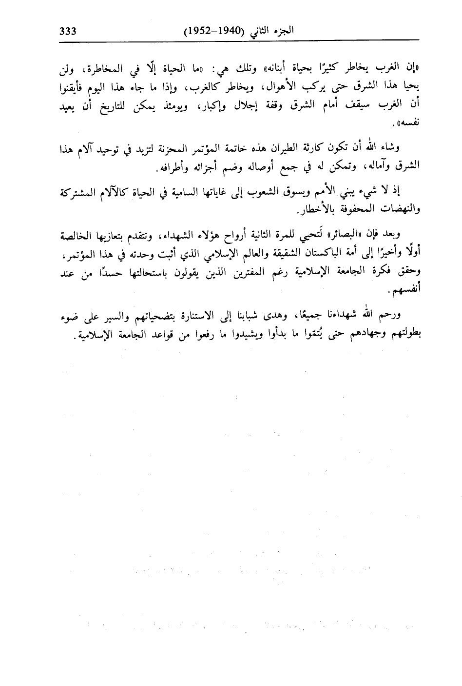 وبعد فإن "البصائر" لَتحي للمرة الثانية أرواح هؤلاء الشهداء، وتتقدم بتعازيها الخالصة أولًا وأخيرًا إلى أمة الباكستان الشقيقة والعالم الإسلامي الذي أثبت وحدته في هذا المؤتمر، وحقق فكرة الجامعة الإسلامية رغم المفترين الذين يقولون باستحالتها حسدًا من عند أنفسهم.