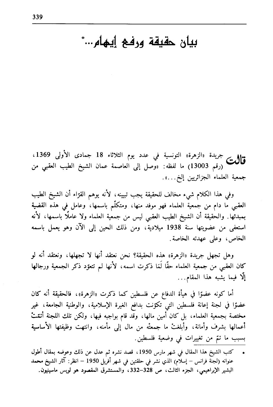 وفي هذا الكلام شيء مخالف للحقيقة يجب تبيينه، لأنه يوهم القرّاء أن الشيخ الطيب العقبي ما دام من جمعية العلماء فهو موفد منها، ومتكلّم باسمها، وعامل في هذه القضية بمبدئها. والحقيقة أن الشيخ الطيب العقبي ليس من جمعية العلماء ولا عاملًا باسمها، لأنه استعفى من عضويتها سنة 1938 ميلادية، ومن ذلك الحين إلى الآن وهو يعمل باسمه الخاص، وعلى عهدته الخاصة.