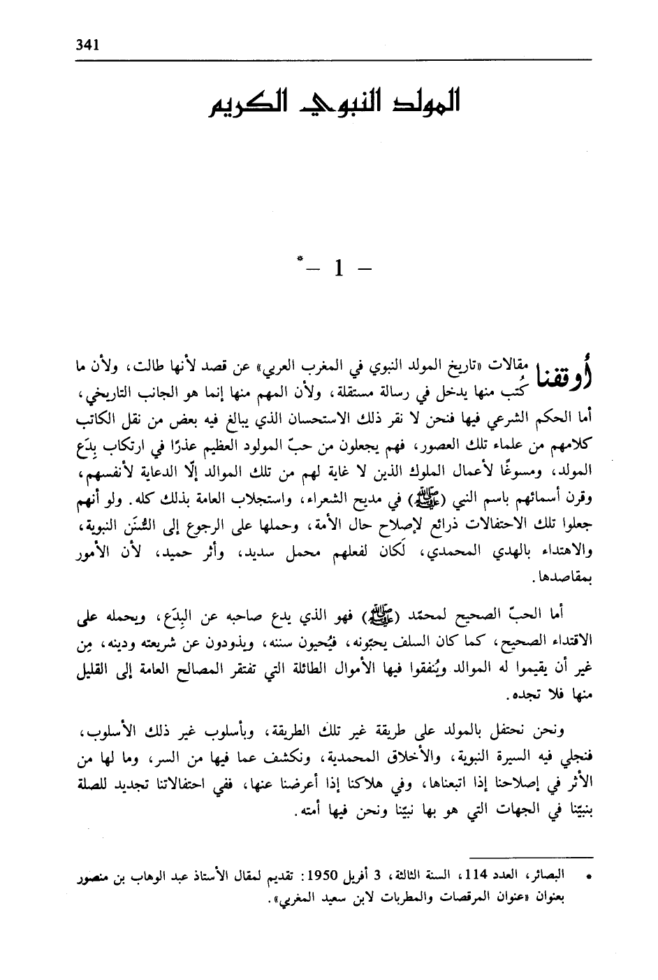 أوقفنا مقالات "تاريخ المولد النبوي في المغرب العربي" عن قصد لأنها طالت، ولأن ما كُتب منها يدخل فى رسالة مستقلة، ولأن المهم منها إنما هو الجانب التاريخي، أما الحكم الشرعي فيها فنحن لا نقر ذلك الاستحسان الذي يبالغ فيه بعض من نقل الكاتب كلامهم من علماء تلك العصور، فهم يجعلون من حبّ المولود العظيم عذرًا في ارتكاب بِدَع المولد، ومسوغًا لأعمال الملوك الذين لا غاية لهم من تلك الموالد إلّا الدعاية لأنفسهم، وقرن أسمائهم باسم النبي - صلى الله عليه وسلم - في مديح الشعراء، واستجلاب العامة بذلك كله. ولو أنهم جعلوا تلك الاحتفالات ذرائع لإصلاح حال الأمة، وحملها على الرجوع إلى السُّنَن النبوية، والاهتداء بالهدي المحمدي، لَكان لفعلهم محمل سديد، وأثر حميد، لأن الأمور بمقاصدها.