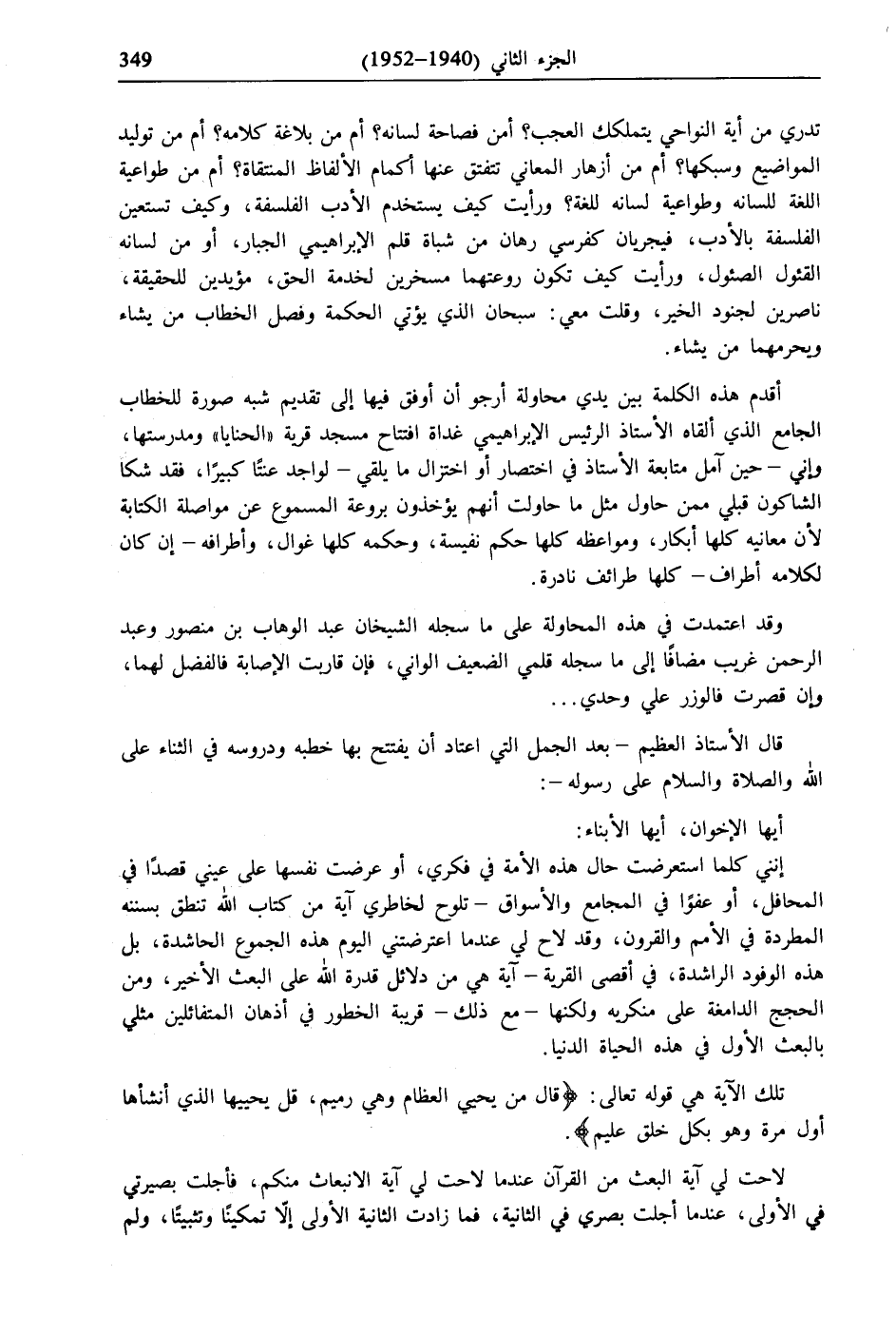 إنني كلما استعرضت حال هذه الأمة في فكري، أو عرضت نفسها على عيني قصدًا في المحافل، أو عفوًا في المجامع والأسواق- تلوح لخاطري آية من كتاب الله تنطق بسننه المطردة في الأمم والقرون، وقد لاح لي عندما اعترضتني اليوم هذه الجموع الحاشدة، بل هذه الوفود الراشدة، في أقصى القرية- آية هي من دلائل قدرة الله على البعث الأخير، ومن الحجج الدامغة على منكريه ولكنها- مع ذلك- قريبة الخطور في أذهان المتفائلين مثلي بالبعث الأول في هذه الحياة الدنيا.