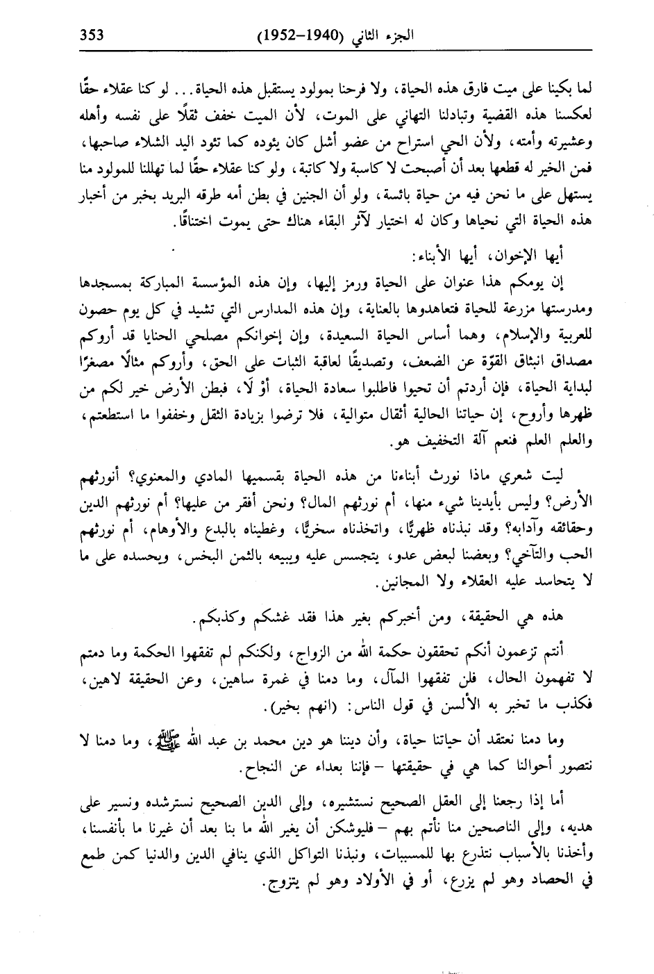 إن يومكم هذا عنوان على الحياة ورمز إليها، وان هذه المؤسسة المباركة بمسجدها ومدرستها مزرعة للحياة فتعاهدوها بالعناية، وإن هذه المدارس التي تشيد في كل يوم حصون للعربية والإسلام، وهما أساس الحياة السعيدة، وإن إخوانكم مصلحي الحنايا قد أروكم مصداق انبثاق القوّة عن الضعف، وتصديقًا لعاقبة الثبات على الحق، وأروكم مثالًا مصغرًا لبداية الحياة، فإن أردتم أن تحيوا فاطلبوا سعادة الحياة، أوْ لَا، فبطن الأرض خير لكم من ظهرها وأروح، إن حياتنا الحالية أثقال متوالية، فلا ترضوا بزيادة الثقل وخففوا ما استطعتم، والعلم العلم فنعم آلة التخفيف هو.