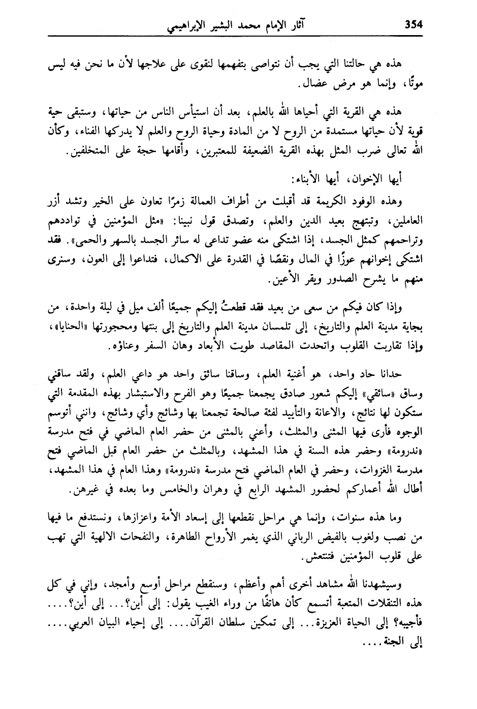 حدانا حاد واحد، هو أغنية العلم، وساقنا سائق واحد هو داعي العلم، ولقد ساقني وساق "سائقي" إليكم شعور صادق يجمعنا جميعًا وهو الفرح والاستبشار بهذه المقدمة التي ستكون لها نتائج، والإعانة والتأييد لفئة صالحة تجمعنا بها وشائج وأي وشائج، وإنني أتوسم الوجوه فأرى فيها المثنى والمثلث، وأعني بالمثنى من حضر العام الماضي في فتح مدرسة "ندرومة" وحضر هذه السنة في هذا المشهد، وبالمثلث من حضر العام قبل الماضي فتح مدرسة الغزوات، وحضر في العام الماضي فتح مدرسة "ندرومة" وهذا العام في هذا المشهد، أطال الله أعماركم لحضور المشهد الرابع في وهران والخامس وما بعده في غيرهن.