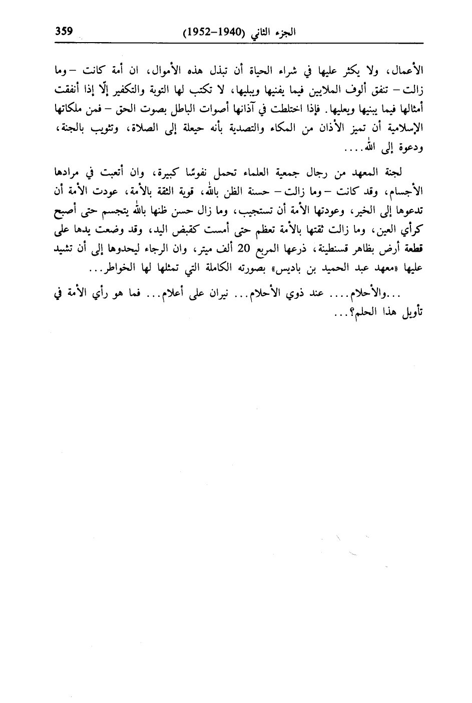 لجنة المعهد من رجال جمعية العلماء تحمل نفوسًا كبيرة، وان أتعبت في مرادها الأجسام، وقد كانت- وما زالت- حسنة الظن بالله، قوية الثقة بالأمة، عودت الأمة أن تدعوها إلى الخير، وعودتها الأمة أن تستجيب، وما زال حسن ظنها بالله يتجسم حتى أصبح كرأي العين، وما زالت ثقتها بالأمة تعظم حتى أمست كقبض اليد، وقد وضعت يدها على قطعة أرض بظاهر قسنطينة، ذرعها المربع 20 ألف ميتر، وان الرجاء ليحدوها إلى أن تشيد عليها "معهد عبد الحميد بن باديس" بصورته الكاملة التي تمثلها لها الخواطر ...