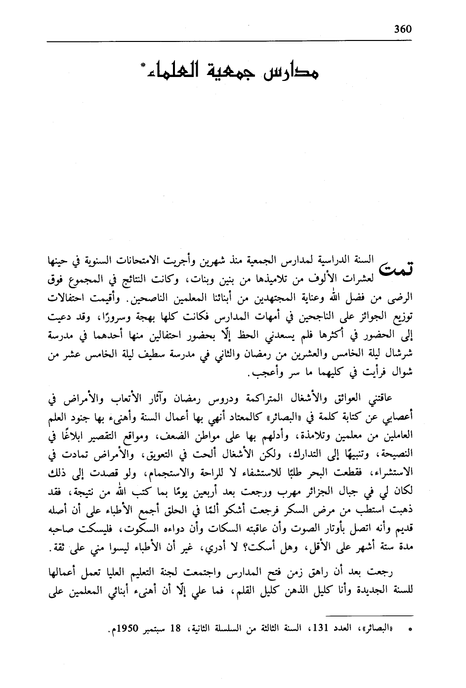 * "البصائر"، العدد 131، السنة الثالثة من السلسلة الثانية، 18 سبتمبر 1950م.