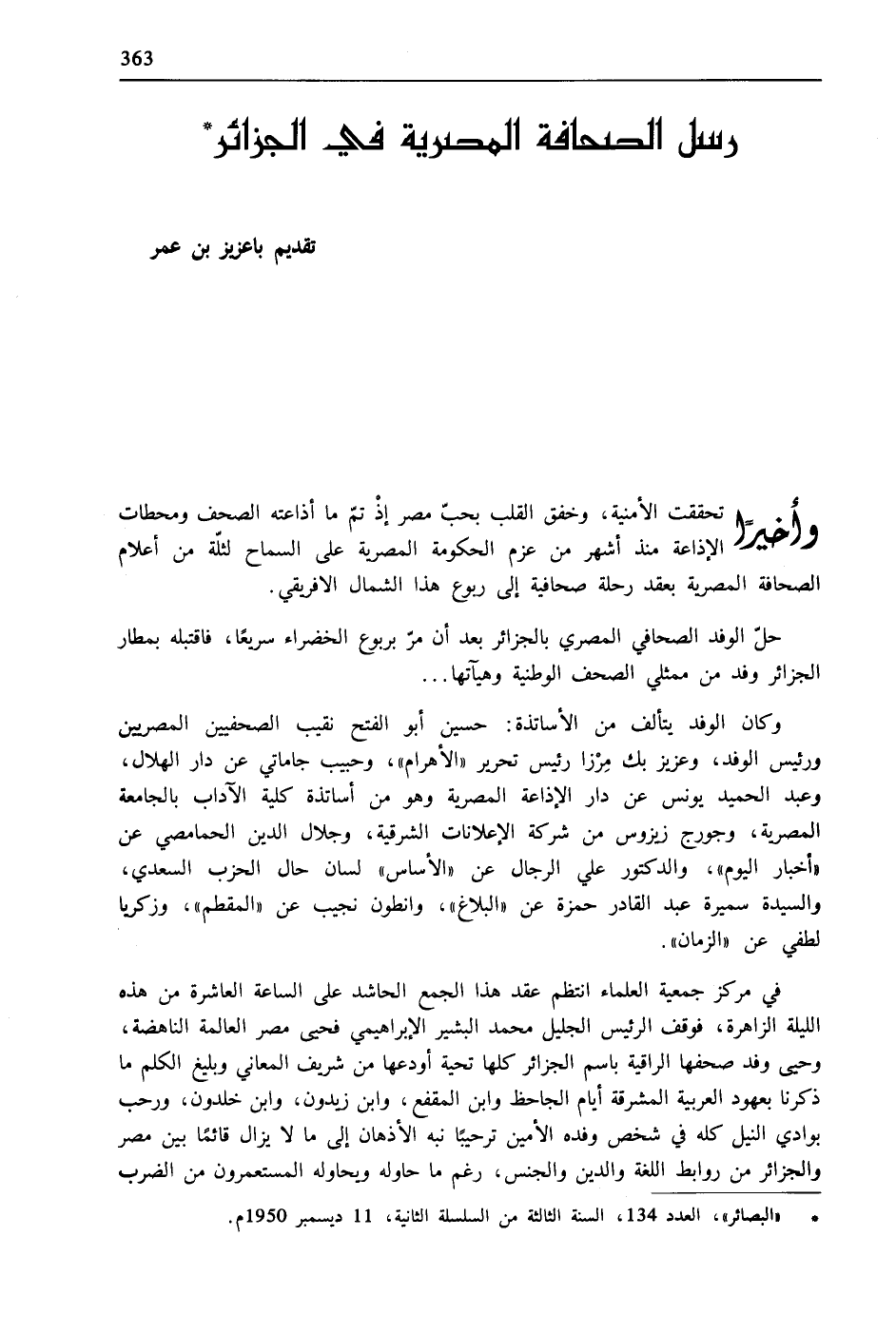 * "البصائر"، العدد 134، السنة الثالثة من السلسلة الثانية، 11 ديسمبر 1950م.