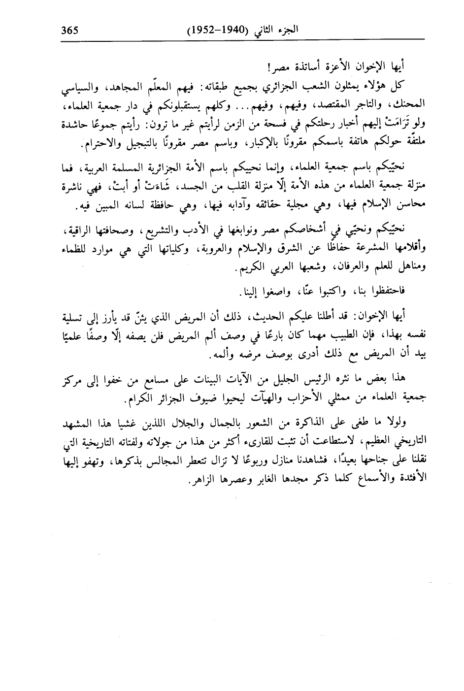 كل هؤلاء يمئلون الشعب الجزائري بجميع طبقاته: فيهم المعلّم المجاهد، والسياسي المحنك، والتاجر المقتصد، وفيهم، وفيهم ... وكلهم يستقبلونكم في دار جمعية العلماء، ولو تَرَامَتْ إليهم أخبار رحلتكم في فسحة من الزمن لرأيتم غير ما ترون: رأيتم جموعًا حاشدة ملتفة حولكم هاتفة باسمكم مقرونًا بالإكبار، وباسم مصر مقرونًا بالتبجيل والاحترام.