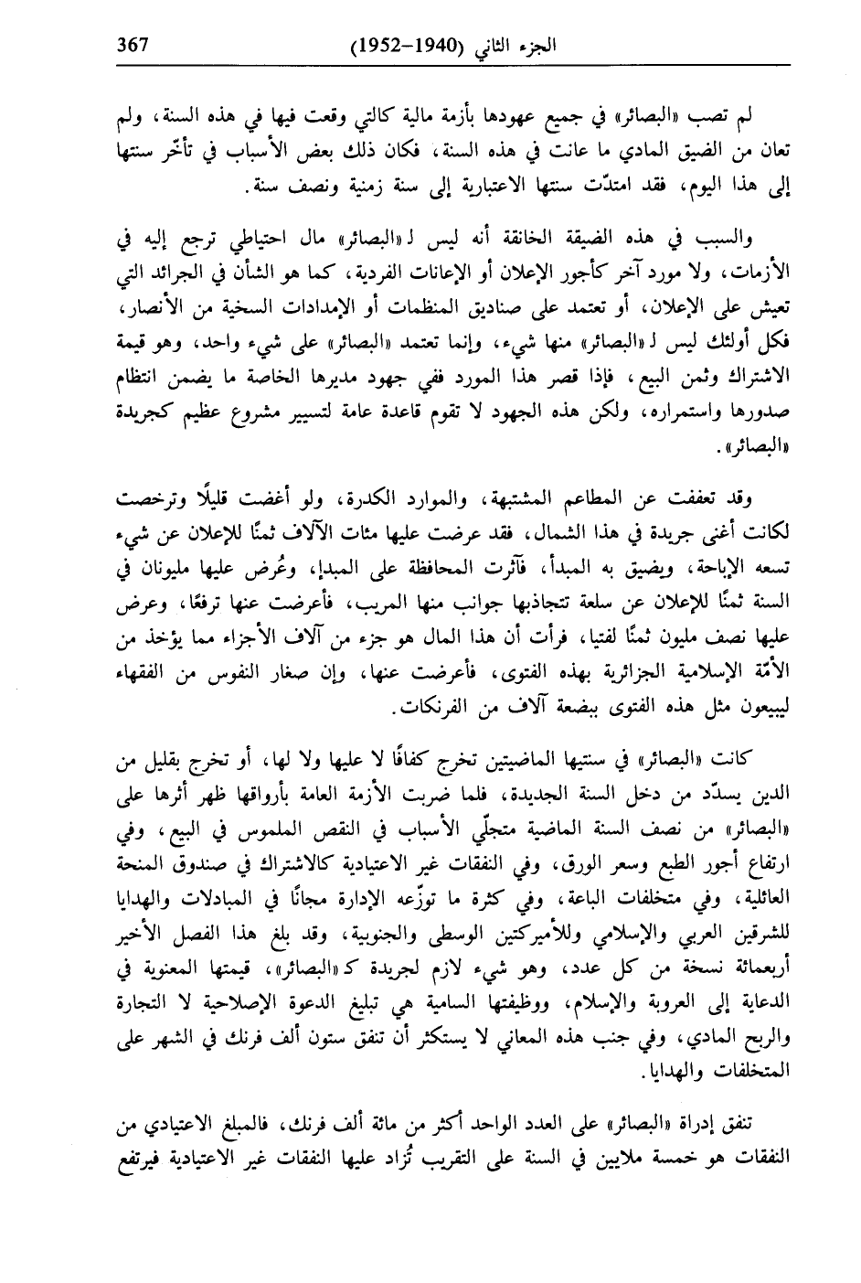 كانت "البصائر" في سنتيها الماضيتين تخرج كفافا لا عليها ولا لها، أو تخرج بقليل من الدين يسدّد من دخل السنة الجديدة، فلما ضربت الأزمة العامة بأرواقها ظهر أثرها على "البصائر" من نصف السنة الماضية متجلّي الأسباب في النقص الملموس في البيع، وفي ارتفاع أجور الطبع وسعر الورق، وفي النفقات غير الاعتيادية كالاشتراك في صندوق المنحة العائلية، وفي متخلفات الباعة، وفي كثرة ما توزّعه الإدارة مجانًا في المبادلات والهدايا للشرقين العربي والإسلامي وللأميركتين الوسطى والجنوبية، وقد بلغ هذا الفصل الأخير أربعمائة نسخة من كل عدد، وهو شيء لازم لجريدة كـ"البصائر"، قيمتها المعنوية في الدعاية إلى العروبة والإسلام، ووظيفتها السامية هي تبليغ الدعوة الإصلاحية لا التجارة والربح المادي، وفي جنب هذه المعاني لا يستكثر أن تنفق ستون ألف فرنك في الشهر على المتخلفات والهدايا.