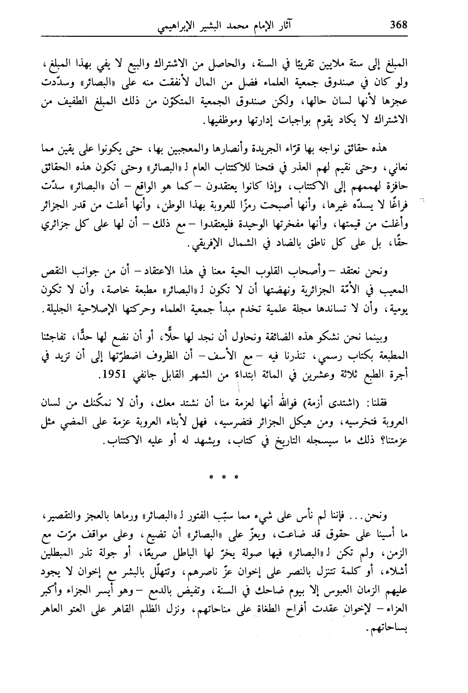 المبلغ إلى ستة ملايين تقريبًا في السنة، والحاصل من الاشتراك والبيع لا يفي بهذا المبلغ، ولو كان في صندوق جمعية العلماء فضل من المال لأنفقت منه على "البصائر" وسدّدت عجزها لأنها لسان حالها، ولكن صندوق الجمعية المتكوّن من ذلك المبلغ الطفيف من الاشتراك لا يكاد يقوم بواجبات إدارتها وموظفيها.