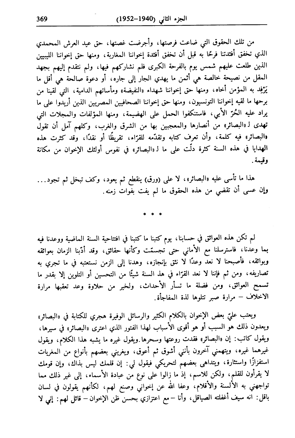 من تلك الحقوق التي ضاعت فرصتها، وأجرضت غصتها، حق عيد العرش المحمدي الذي تخفق أكمدتنا فرحًا به قبل أن تخفق أكمدة إخواننا المغاربة، ومنها حق إخواننا الليبيين الذين طلعت عليهم شمس يوم بالفرحة الكبرى فلم نشاركهم فيها، ولم نتقدم إليهم بجهد المقل من نصيحة خالصة هي أثمن ما يهدي الجار إلى جاره، أو دعوة صالحة هي أقل ما يَرْفِد به المؤمن أخاه، ومنها حق إخواننا شهداء "النفيضة" ومأساتهم الدامية، التي لقينا من برحها ما لقيه إخواننا التونسيون، ومنها حق إخواننا الصحافيين المصريين الذين أريدوا على ما يراد عليه الحُرّ الأبي، فاستنكفوا الحمل على الهضيمة، ومنها المؤلفات والمجلات التي تهدى لـ"البصائر" من أنصارها والمعجبين بها من الشرق والغرب، وكلهم آمل أن تقول "البصائر" فيه كلمة، وأن تعرف كتابه وتقدّمه للقرّاء، تقريظًا أو نقدًا، وقد كثرت هذه الهدايا في هذه السنة كثرة دلّت على ما لـ"البصائر" في نفوس أولئك الإخوان من مكانة وقيمة.