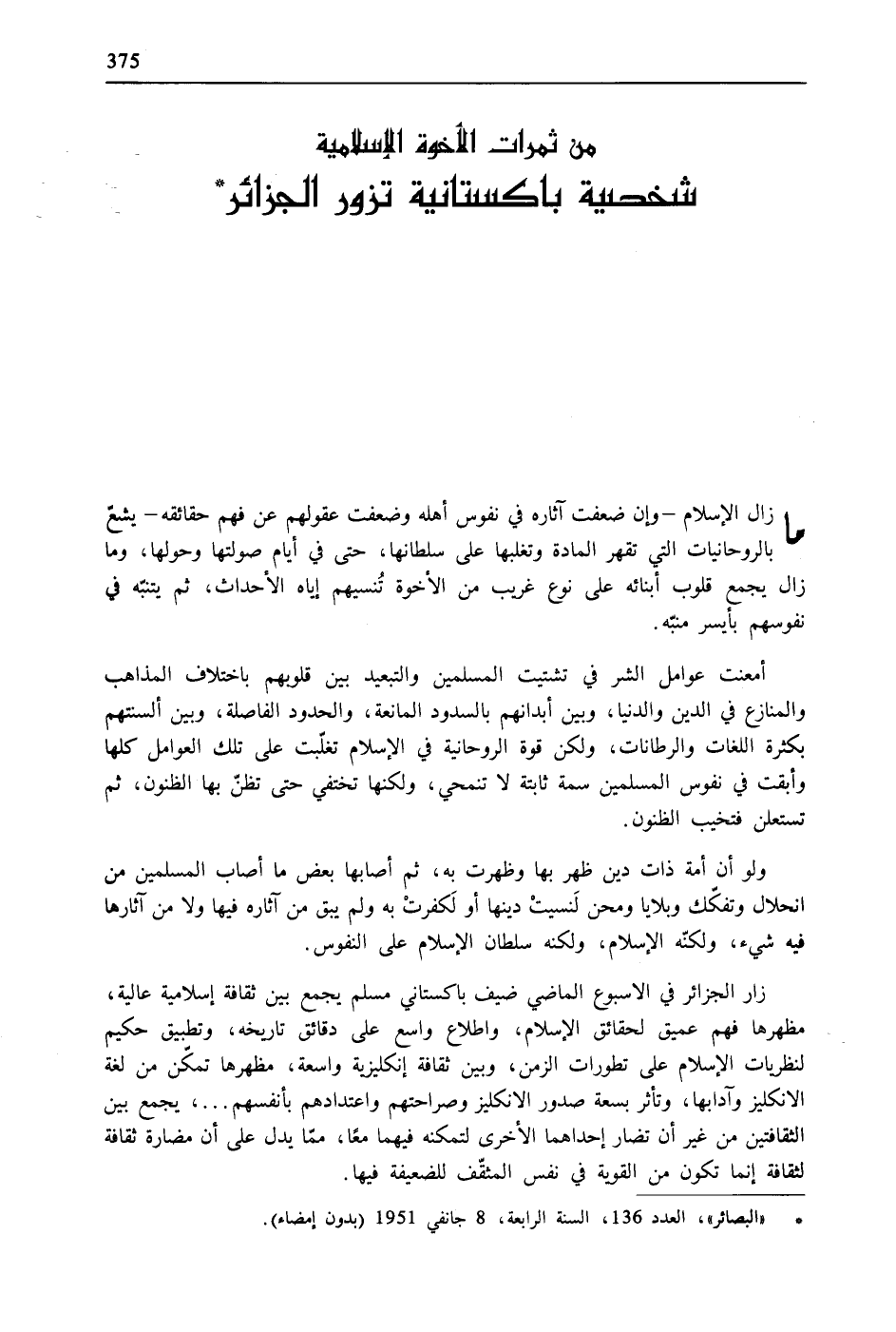 زار الجزائر في الأسبوع الماضي ضيف باكستاني مسلم يجمع بين ثقافة إسلامية عالية، مظهرها فهم عميق لحقائق الإسلام، واطلاع واسع على دقائق تاريخه، وتطبيق حكيم لنظريات الإسلام على تطورات الزمن، وبين ثقافة إنكليزية واسعة، مظهرها تمكن من لغة الانكليز وآدابها، وتأثر بسعة صدور الانكليز وصراحتهم واعتدادهم بأنفسهم ... ، يجمع بين الثقافتين من غير أن تضار إحداهما الأخرى لتمكنه فيهما معًا، ممّا يدل على أن مضارة ثقافة لثقافة إنما تكون من القوية في نفس المثقّف للضعيفة فيها.