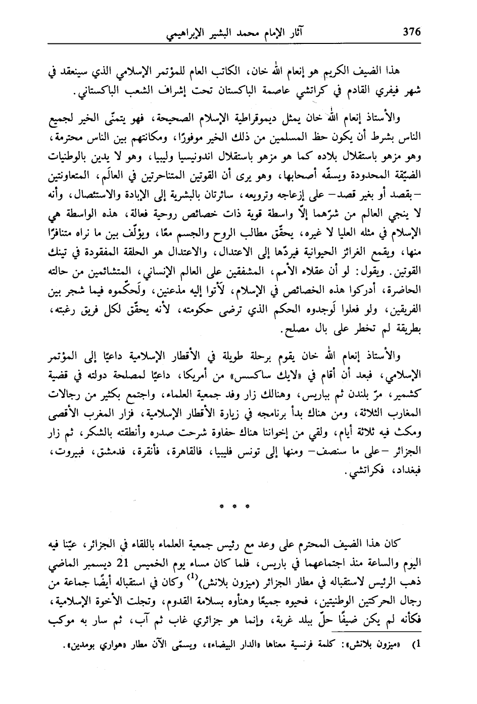 والأستاذ إنعام الله خان يقوم برحلة طويلة في الأقطار الإسلامية داعيًا إلى المؤتمر الإسلامي، فبعد أن أقام في "لايك ساكسس" من أمريكا، داعيًا لمصلحة دولته في قضية كشمير، مرّ بلندن ثم بباريس، وهنالك زار وفد جمعية العلماء، واجتمع بكثير من رجالات المغارب الثلاثة، ومن هناك بدأ برنامجه في زيارة الأقطار الإسلامية، فزار المغرب الأقصى ومكث فيه ثلاثة أيام، ولقي من إخواننا هناك حفاوة شرحت صدره وأنطقته بالشكر، ثم زار الجزائر- على ما سنصف- ومنها إلى تونس فليبيا، فالقاهرة، فأنقرة، فدمشق، فبيروت، فبغداد، فكراتشي.