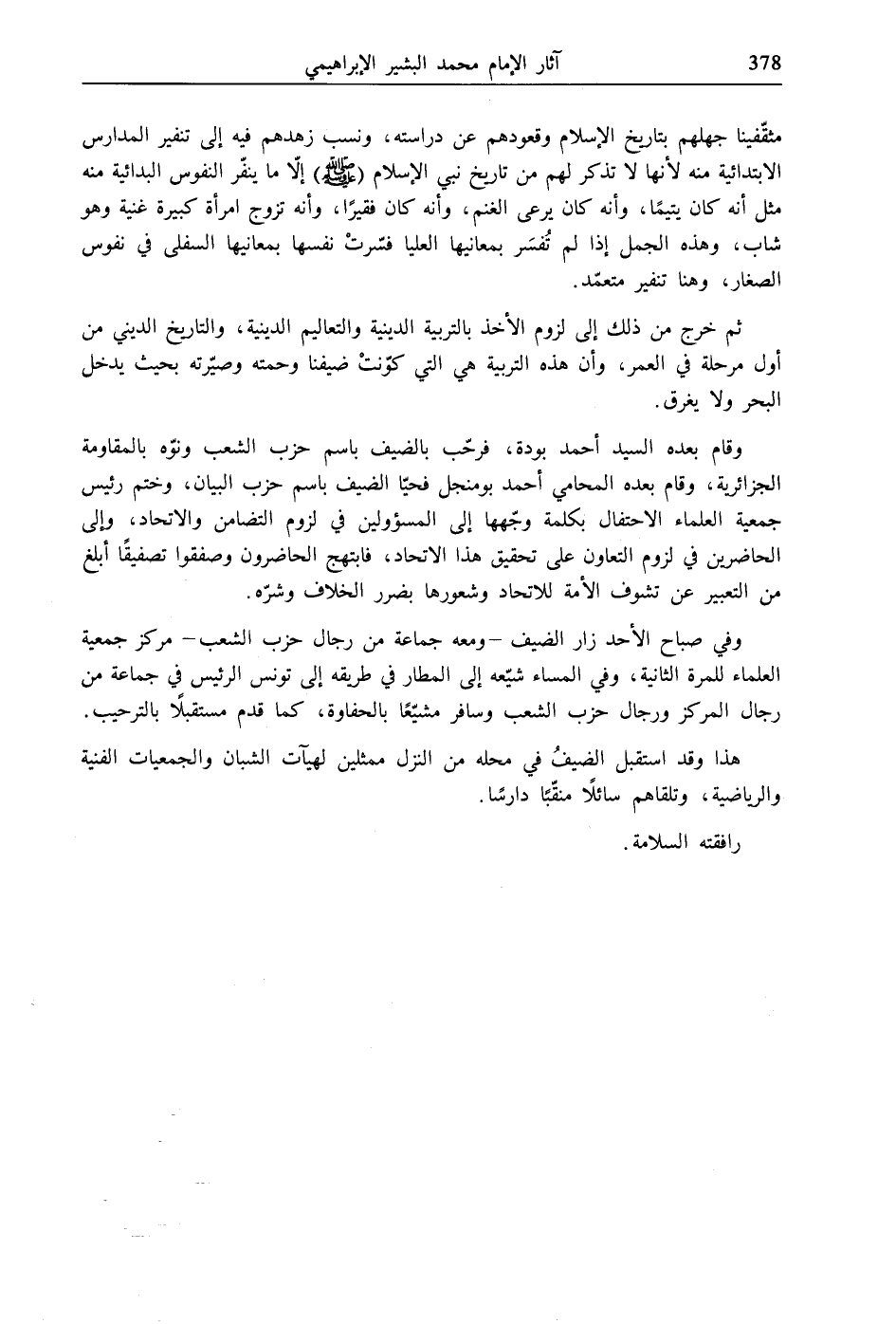 وفي صباح الأحد زار الضيف- ومعه جماعة من رجال حزب الشعب- مركز جمعية العلماء للمرة الثانية، وفي المساء شيّعه إلى المطار في طريقه إلى تونس الرَّئِيسُ في جماعة من رجال المركز ورجال حزب الشعب وسافر مشيّعًا بالحفاوة، كما قدم مستقبلًا بالترحيب.