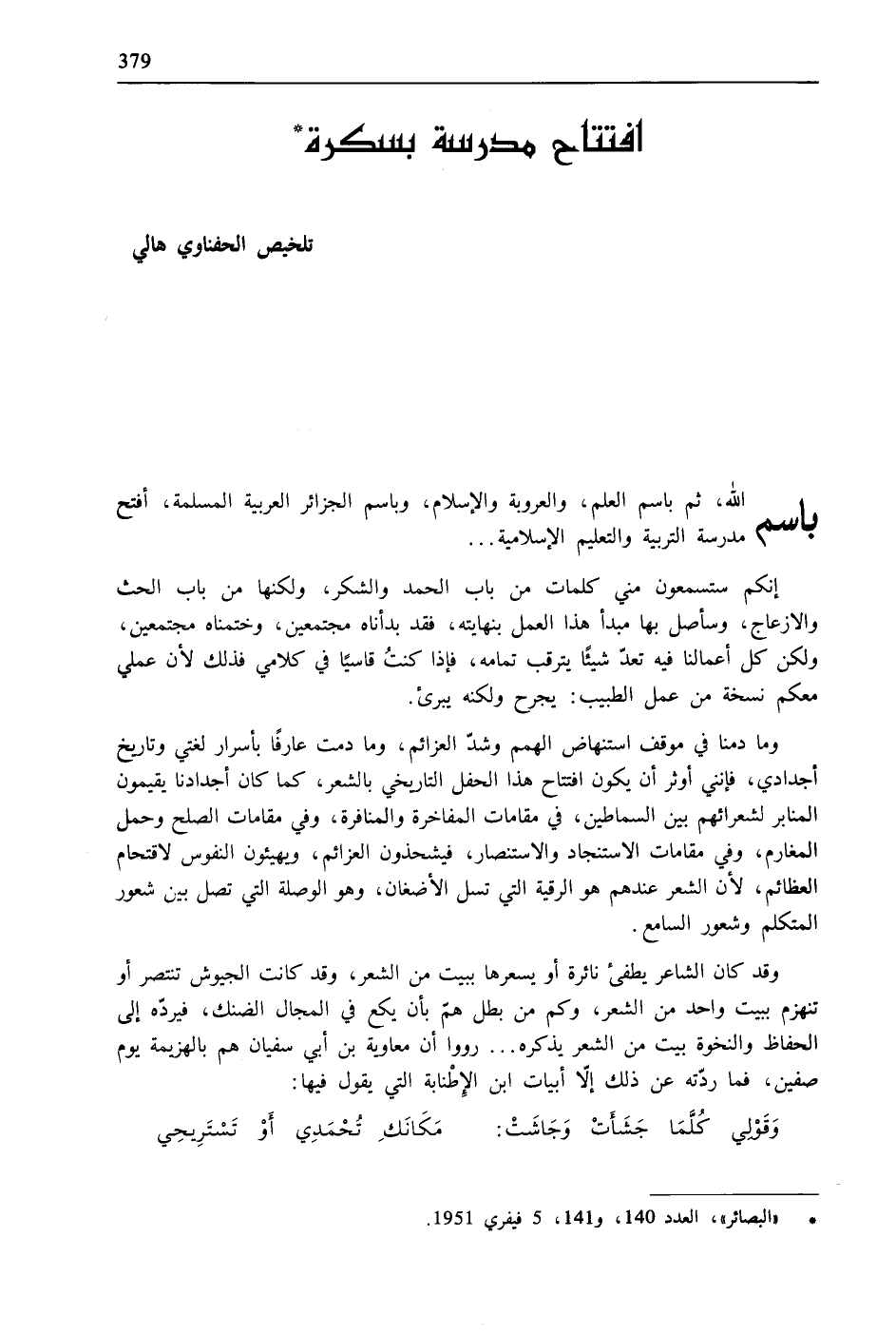 * "البصائر"، العدد 140، و141، 5 فيفري 1951.
