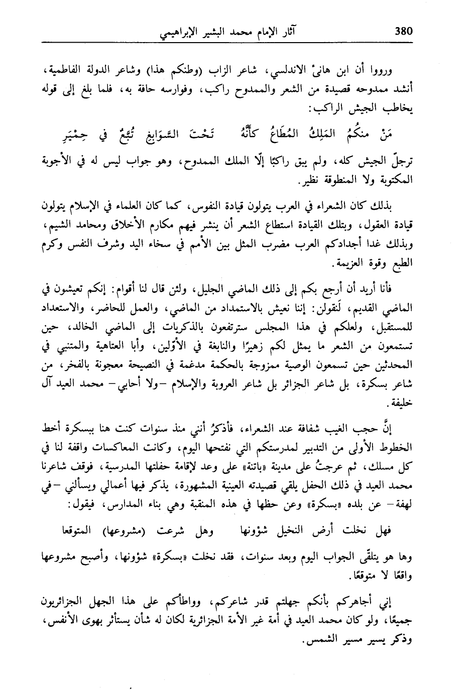 فأنا أريد أن أرجع بكم إلى ذلك الماضي الجليل، ولئن قال لنا أقوام: إنكم تعيشون في الماضى القديم، لَنقولن: إننا نعيش بالاستمداد من الماضي، والعمل للحاضر، والاستعداد للمستقبل، ولعلكم في هذا المجلس سترتفعون بالذكريات إلى الماضي الخالد، حين تستمعون من الشعر ما يمثل لكم زهيرًا والنابغة في الأوّلين، وأبا العتاهية والمتنبي في المحدثين حين تسمعون الوصية ممزوجة بالحكمة مدغمة في النصيحة معجونة بالفخر، من شاعر بسكرة، بل شاعر الجزائر بل شاعر العروبة والإسلام- ولا أحابي- محمد العيد آل خليفة.