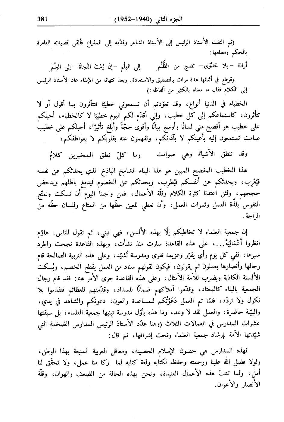 وقوطع في أثنائها عدة مرات بالتصفيق والاستعادة. وبعد انتهائه من الإلقاء عاد الأستاذ الرَّئِيسُ إلى الكلام فقال ما معناه بالكثير من ألفاظه:)