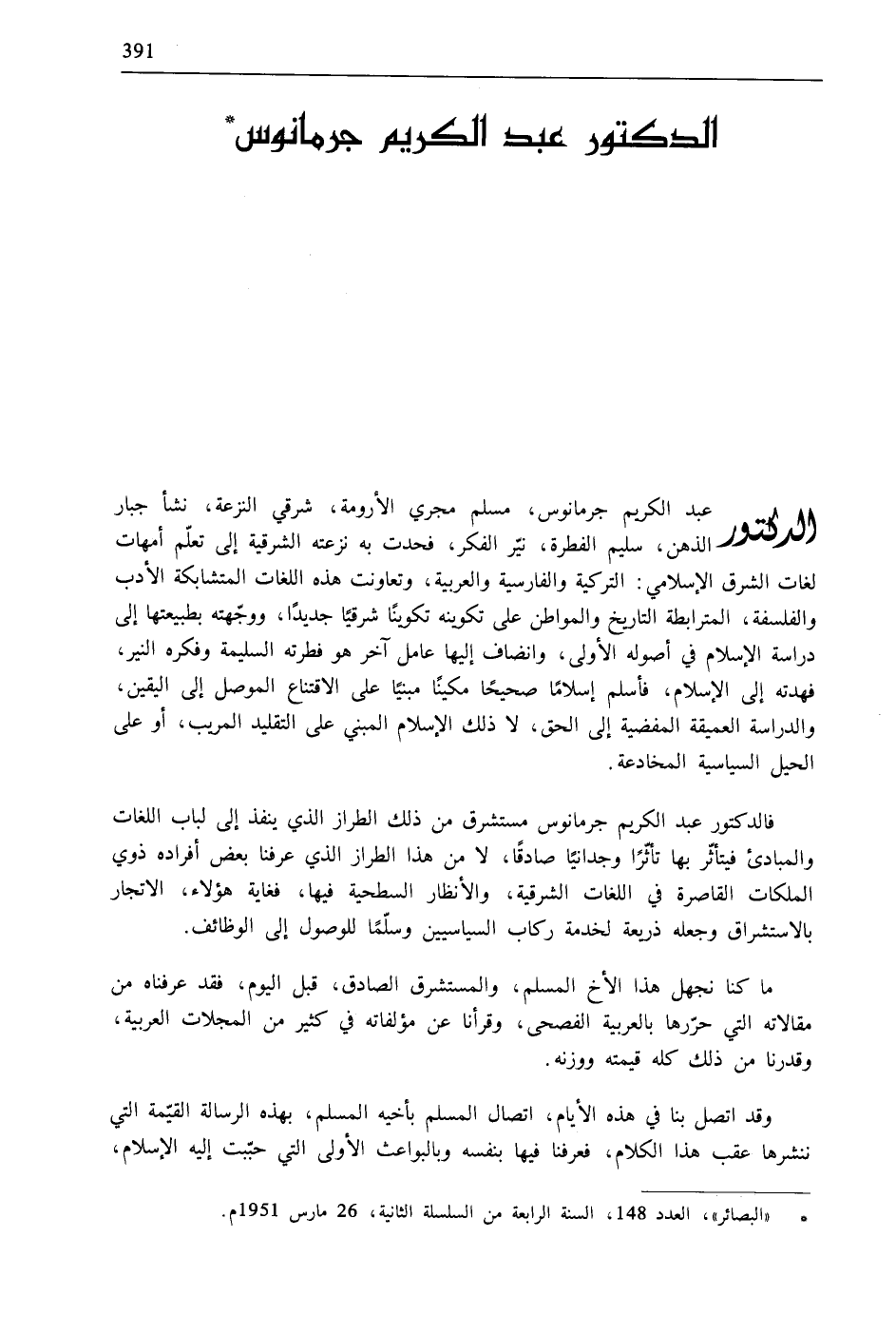 ما كنا نجهل هذا الأخ المسلم، والمستشرق الصادق، قبل اليوم، فقد عرفناه من مقالاته التي حرّرها بالعربية الفصحى، وقرأنا عن مؤلفاته في كثير من المجلات العربية، وقدرنا من ذلك كله قيمته ووزنه.