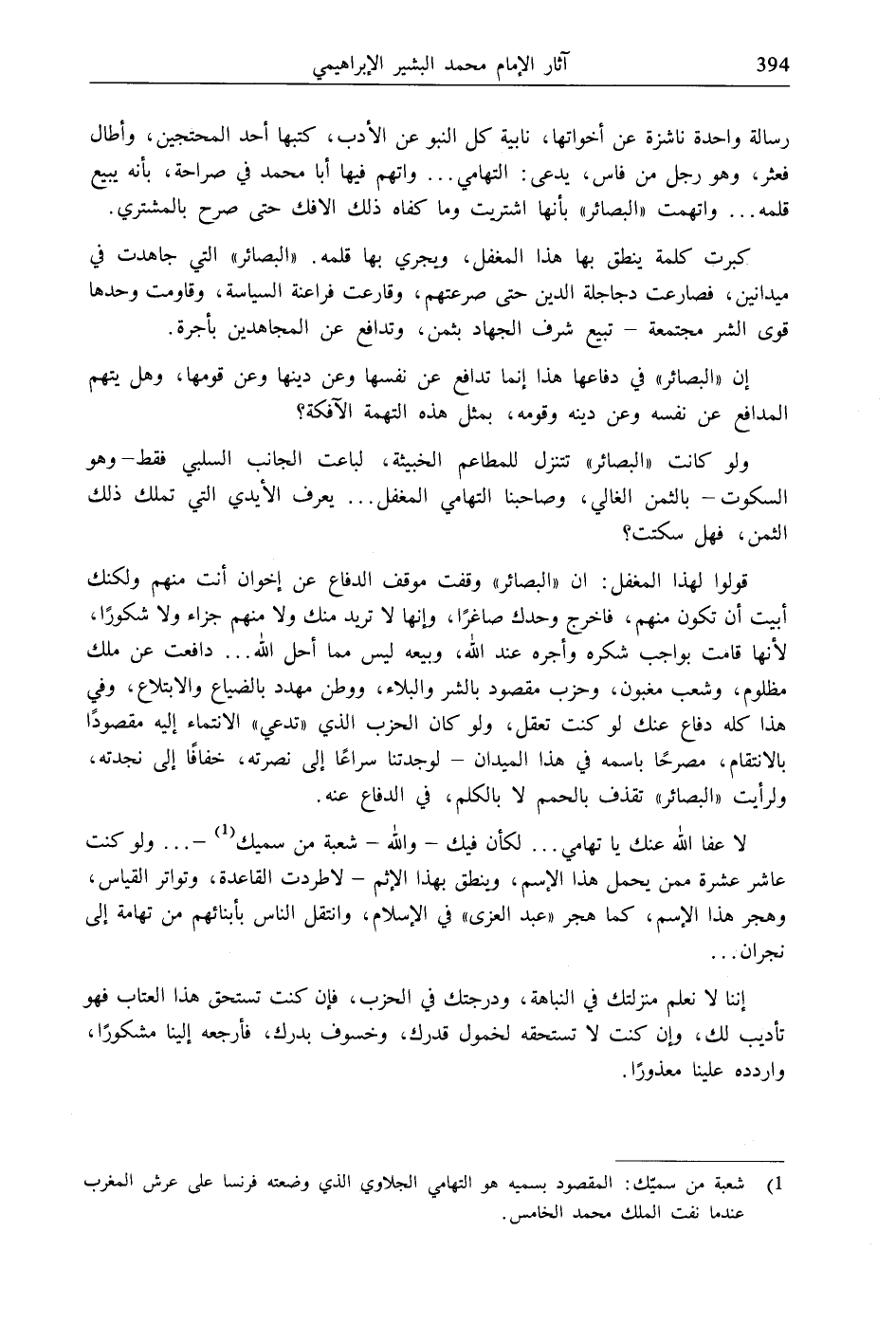 قولوا لهذا المغفل: ان "البصائر" وقفت موقف الدفاع عن إخوان أنت منهم ولكنك أبيت أن تكون منهم، فاخرج وحدك صاغرًا، وإنها لا تريد منك ولا منهم جزاء ولا شكورًا، لأنها قامت بواجب شكره وأجره عند الله، وبيعه ليس مما أحل الله ... دافعت عن ملك مظلوم، وشعب مغبون، وحزب مقصود بالشر والبلاء، ووطن مهدد بالضياع والابتلاع، وفي هذا كله دفاع عنك لو كنت تعقل، ولو كان الحزب الذي "تدعي" الانتماء إليه مقصودًا بالانتقام، مصرحًا باسمه في هذا الميدان- لوجدتنا سراعًا إلى نصرته، خفافًا إلى نجدته، ولرأيت "البصائر" تقذف بالحمم لا بالكلم، في الدفاع عنه.