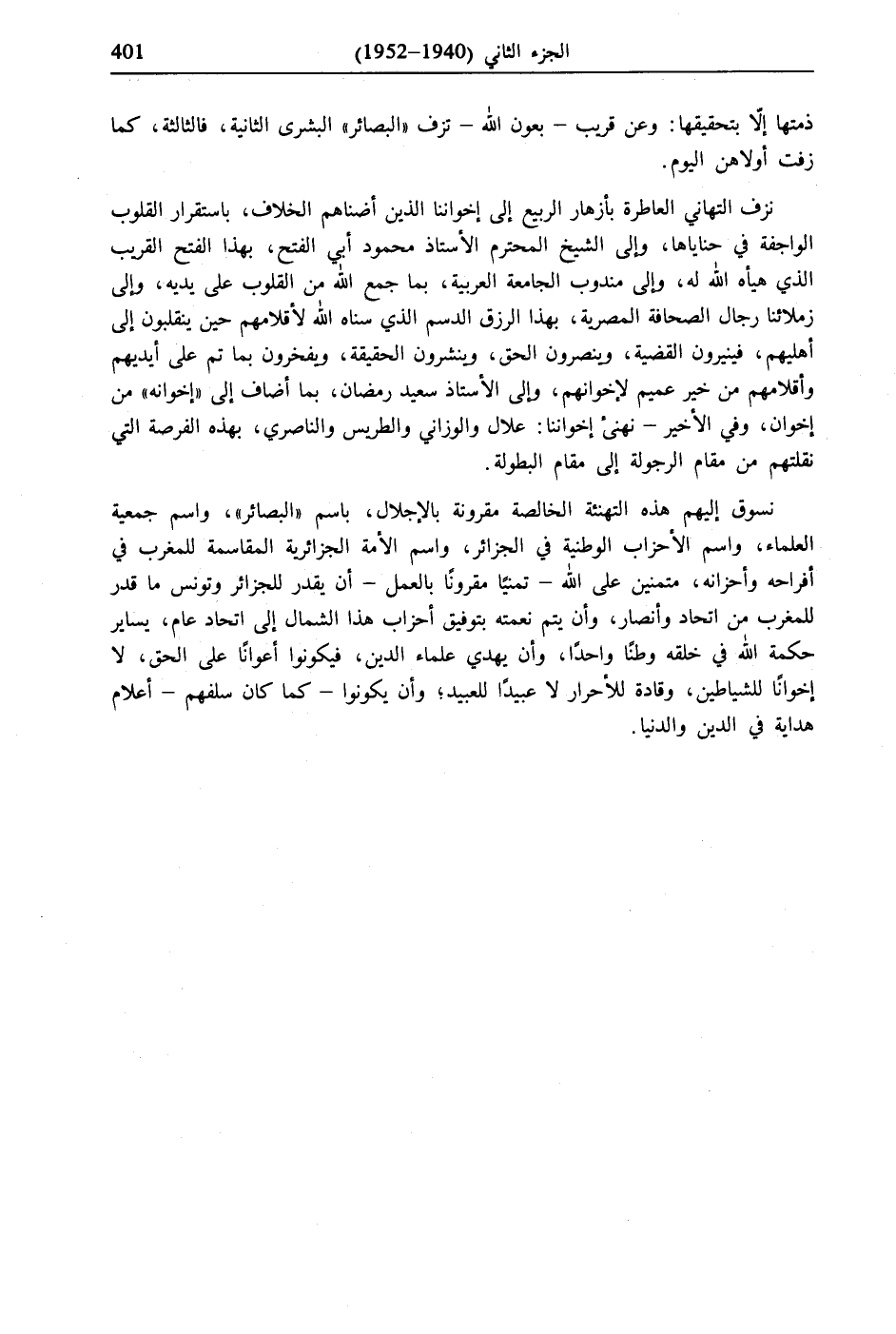 ذمتها إلا بتحقيقها: وعن قريب- بعون الله- تزف "البصائر" البشرى الثانية، فالثالثة، كما زفت أولاهن اليوم.