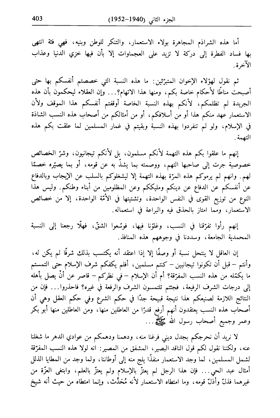 ثم نقول لهؤلاء الإخوان المتبرّئين: ما هذه النسبة التي خصصتم أنفسكم بها حتى أصبحت مناطًا لأحكام خاصة بكم، ومنها هذا الاتهام؟ ... وان العقلاء ليحكمون بأن هذه الجريدة لم تظلمكم، لأنكم بهذه النسبة الخاصة أوقفتم أنفسكم هذا الموقف ولأن الاستعمار عهد منكم هذا أو من أسلافكم، أو من أمثالكم من أصحاب هذه النسب الشاذة في الإسلام، ولو لم تنفردوا بهذه النسبة وبقيتم في غمار المسلمين لما علقت بكم هذه التهمة.